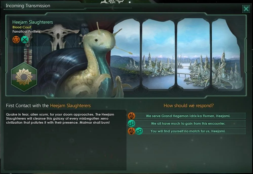 Забавны случайные государства, среди которых получаются и улитки-ксенофобы, как на скриншоте выше, которые при первом контакте говорят тебе "дрожать от страха, ибо ваша гибель приближается" и обещают "очистить галактику от любых грязерожденных цивилизаций ксеносов, отравляющих её свои присутствием". Ну то есть от вас :)