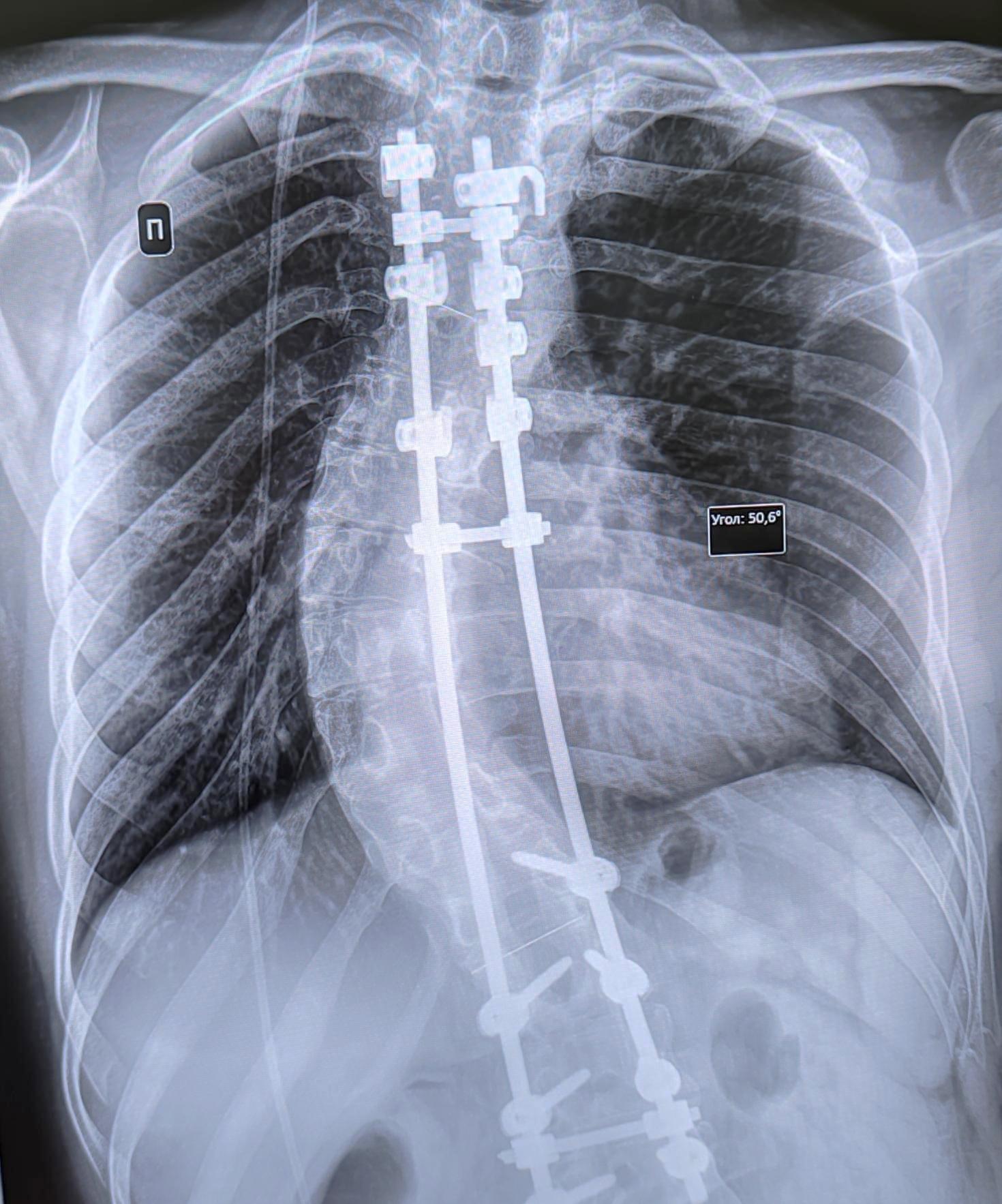Выраженная ротация, торсия тел позвонков грудо-поясничного отдела позвоночника, визуализируется правосторонняя сколиотическая дуга с вершиной на Th8-9,с углом девиации 50.6 градусов, в условиях установленной металлоконструкции для коррекции сколиотической деформации с транспедикулярной фиксацией в Th12-L3 позвонках, резорбции костной ткани вокруг металлоконструкции не выявлено. Заключение: Правосторонний сколиоз грудо-поясничного отдела позвоночника 4 (четвертой )ст. в условиях корригирующего МОС.