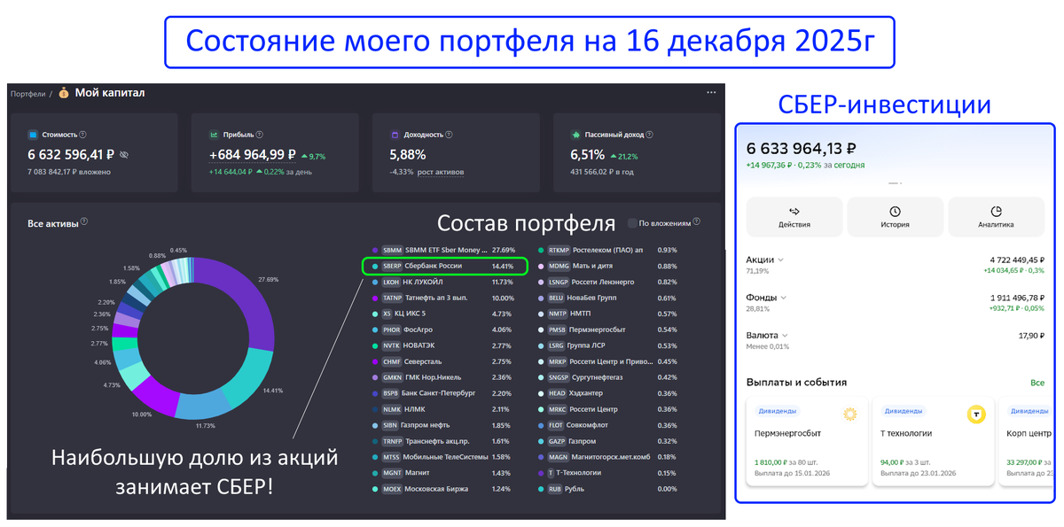 В итоге, акции СБЕРа - это базовый актив для портфеля любого дивидендного инвестора. В моём портфеле СБЕР занимает наибольшую долю среди всех других бумаг: