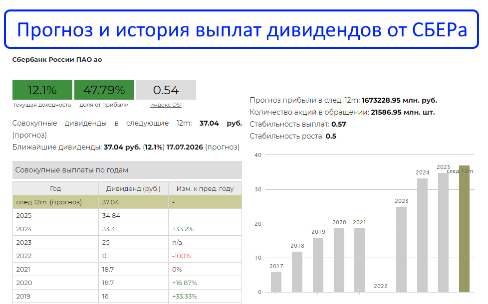 У СБЕРа понятная дивидендная политика — 50% от чистой прибыли по МСФО. Поэтому спрогнозировать размер выплат довольно легко и исходя из текущих результатов и финансовых показателей, дивиденды по итогам 2025г могут составить около 37–38р на акцию (дивдоходность=12% годовых).