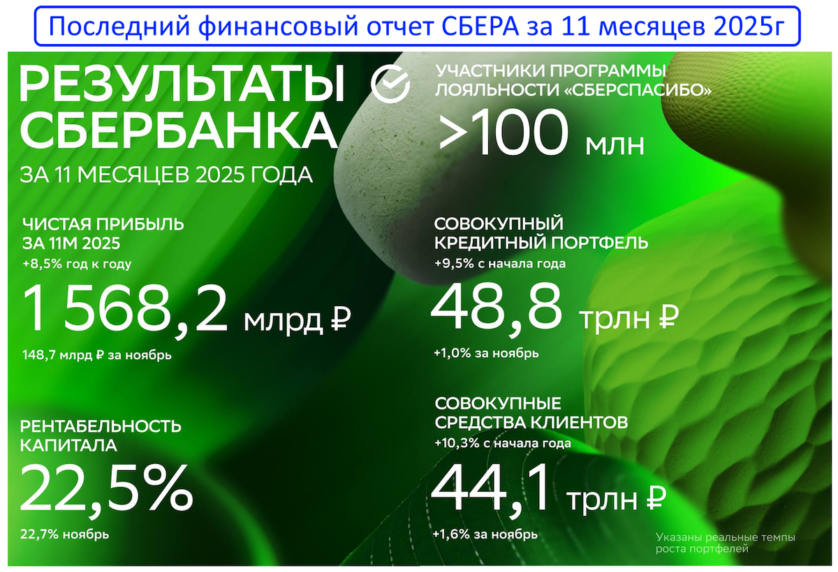 За 11 месяцев 2025г СБЕР уже заработал 1.57 трлн р чистой прибыли (+8.5% к прошлому году). Декабрь ещё впереди, так что итоговый результат гарантированно побьёт рекорд 2024г (1.58 трлн)!