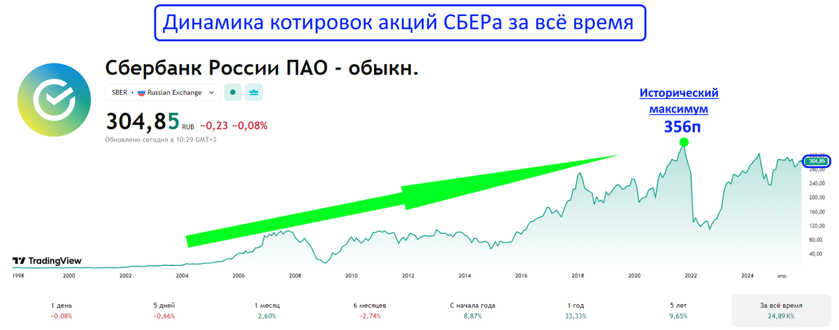Если посмотреть на акции СБЕРа, то сейчас они выглядят лучше рынка и находятся недалеко от своих исторических максимумов: