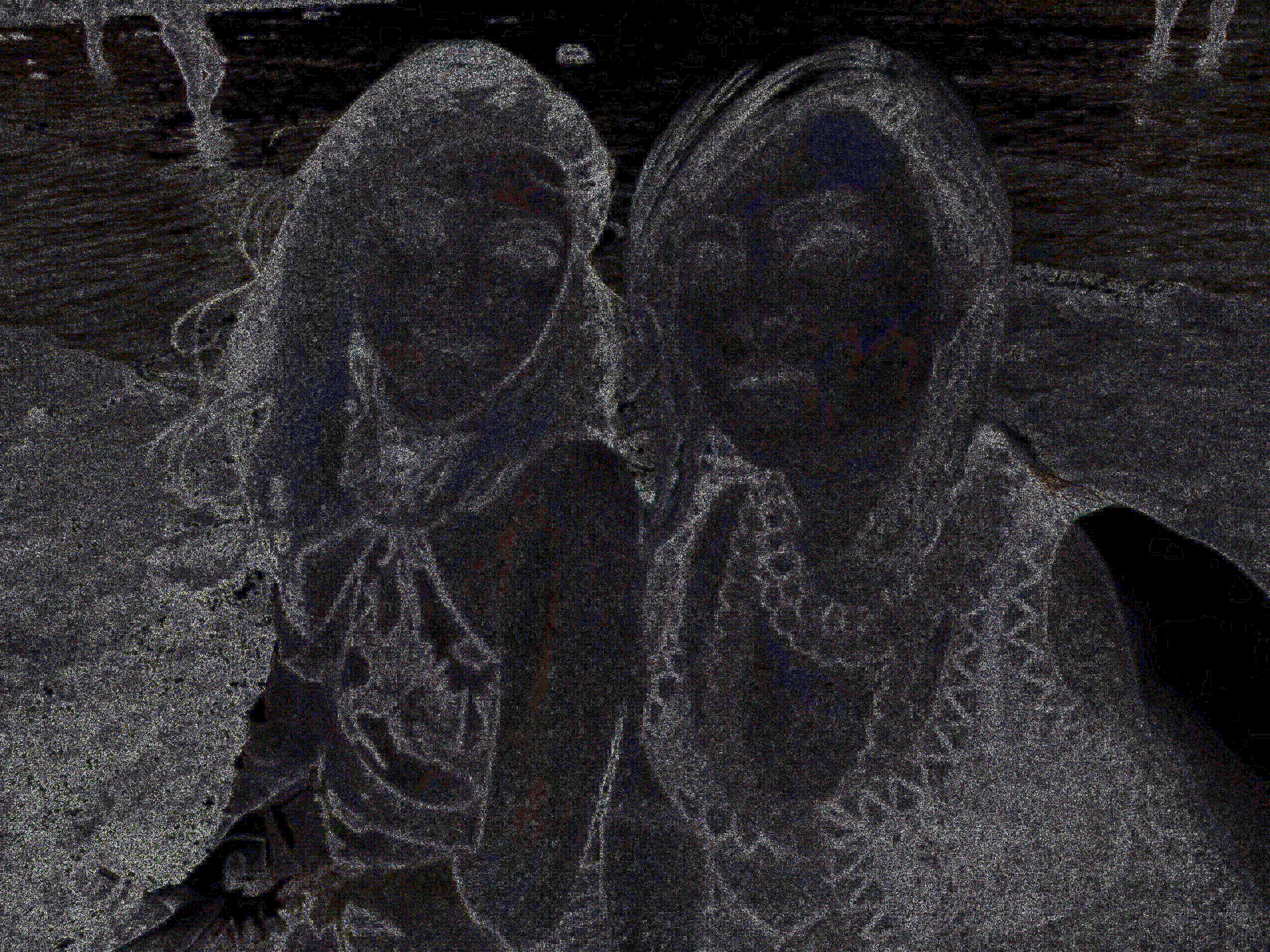 Как по мне, отфотошоплены рука левой (где радужные пятна и край вырезан или обведен), лица, губы, глаза - у обоих. Грудь, чсх, нет, рука просто засвечена. Тени под глазами правой - нанесены натурально, потом сглажены.