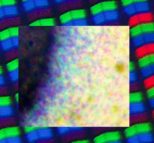 Да в снимке с пикселями есть шум (его лучше видно после эффекта Sharpness, который я добавил чтобы показать, что различимы отдельные LED-ы в пикселях, это хорошая демонстрация возможностей моей микрофото-установки, сравните с другими снимками экранов iPhone 6S на микроскоп, например в этом видео: https://www.youtube.com/watch?v=qjjbfbQk-sI). Шум есть, но не такой как зерно на плёнке. Вы сильно увеличили участок. Прилагаю наложение и участка плёнки том же масштабе (вторая картинка).