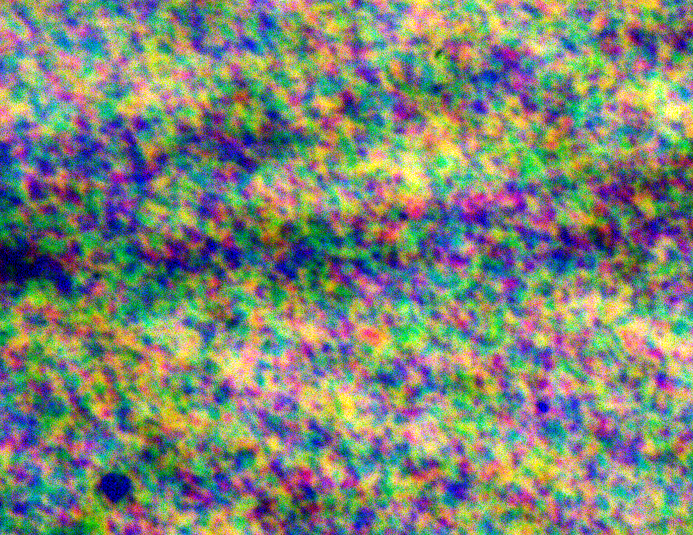 Наблюдается разноцветное зерно. Напоминает цифровой шум.