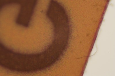 вот прикрепляю фото сделанные на свою установку для микрофото. эту же букву G (там GB) нашел (приложил линейку — действительно около 1мм). пленка чуть подогнулась и вышло не везде резко, ну а следующий кадр это когда чуть сдвинул плёнку, в верхнем правом углу видно часть перфорации и можно оценить резкость (мне кажется, намного лучше). внизу слева уже сам кадр. интересно, что "зёрна" видно даже вне кадра. ещё один кадр это дальнейшее продвижение плёнки (примерно центр кадра: волосы), тоже довольно резкий.