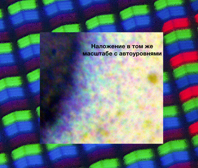 Третья картинка — добавил к наложению такой же Sharpness как и на фото пикселей и можно даже разглядеть какой на самом деле там мелкий "шум матрицы".