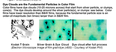 Здесь говорится, что Dye cloud (назовём это облачками красителя) — фундаментальная частица в цветной плёнке, диаметр 10-25 микрон. Как видим серебрянное зерно находится внутри этого облачка и теряется после проявки.