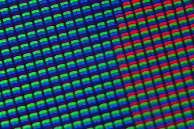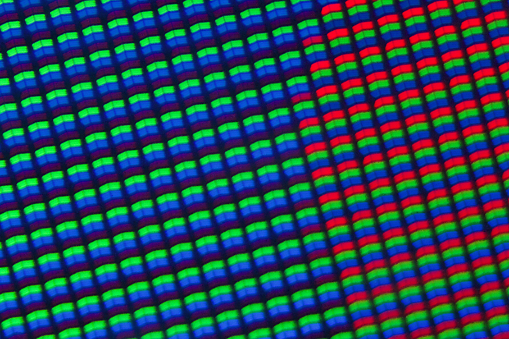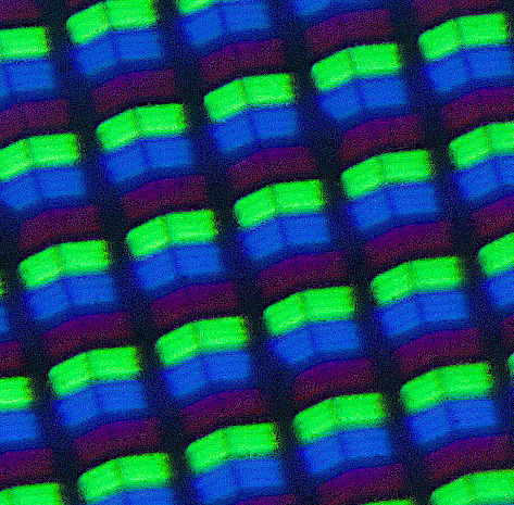Это не может быть шум матрицы ну никак, он слишком уж мелкозернистый да и на ISO 100 его будет не много. Я сфотографировал именно то, что физически там находится на поверхности плёнки. Вот снимок дисплея iPhone 6S этой установкой в тех же точно условиях. Если бы у меня был шум матрицы в виде зёрен плёнки (что просто невероятно), то и здесь бы это проявилось. Но нет, просто пиксели.  И на пылинках почему-то нет никаких "шумов матрицы" и если вы обратите внимание на тот мой первый снимок с буквой G, там где плёнка подогнулась и вышла из фокуса: зёрна размываются. Был бы это шум матрицы, он проявился бы и там.