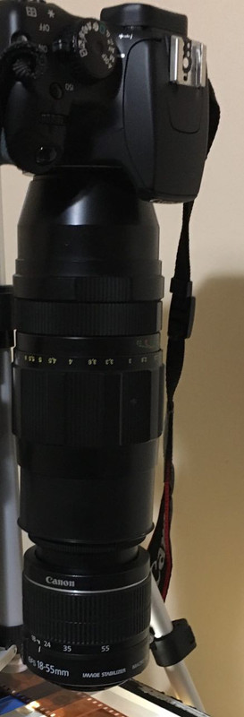 Взять фотоаппарат с длиннофокусным объективом и к передней линзе передней линзой прикрепить короткофокусный. У меня эта пара: Юпитер-21М и Canon EF-S 18-55 IS II, ничего редкого. Я пробовал добавить 34мм макрокольцо, понравилось, но и без него было хорошо. Понятное дело, на штатив это всё, закрепить чтобы поменьше дрожало, плёнку на столик с подсветкой, фокус везде выставить на МДФ, потом точно сфокусироваться на длиннофокусном. У меня расстояние от объектива до столика было меньше сантиметра.