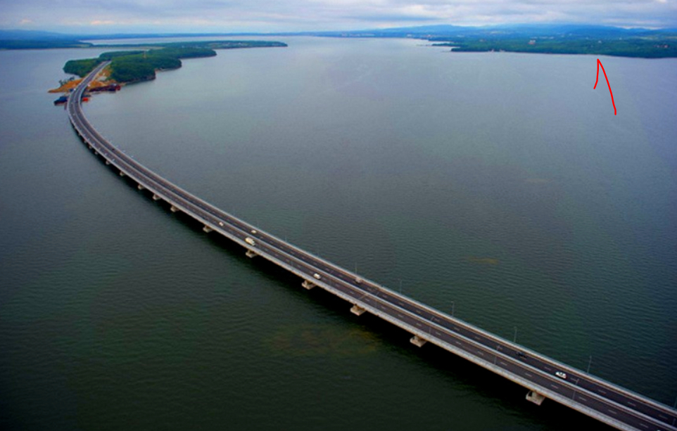 Первый из гигантов - часто теряющийся в тумане низководный мост через Амурский залив. Самый нефотогеничный из трёх мостов, осознать его размеры можно разве что из иллюминатора самолёта. До недавнего времени он был вторым по длине (4364 метра) мостом России - после Ульяновского моста через Волгу.