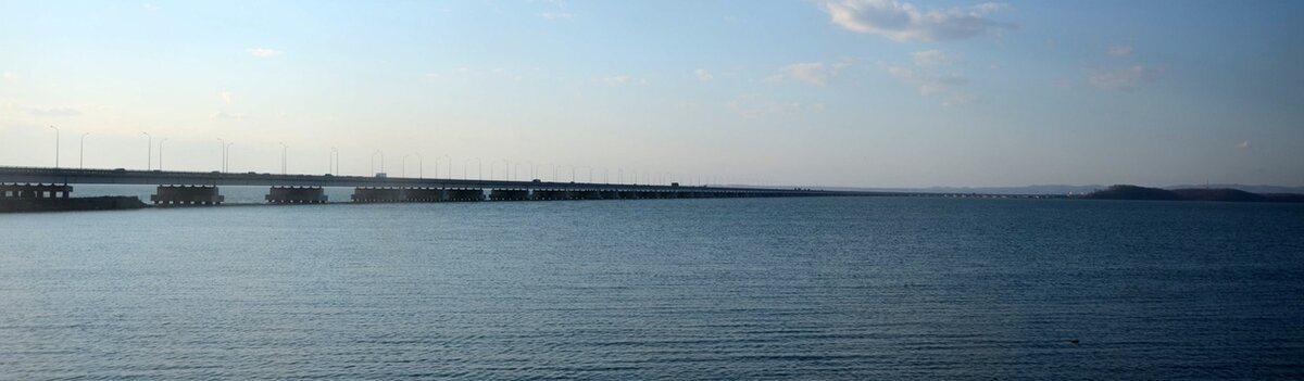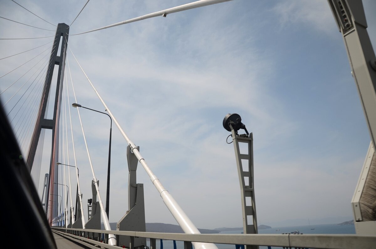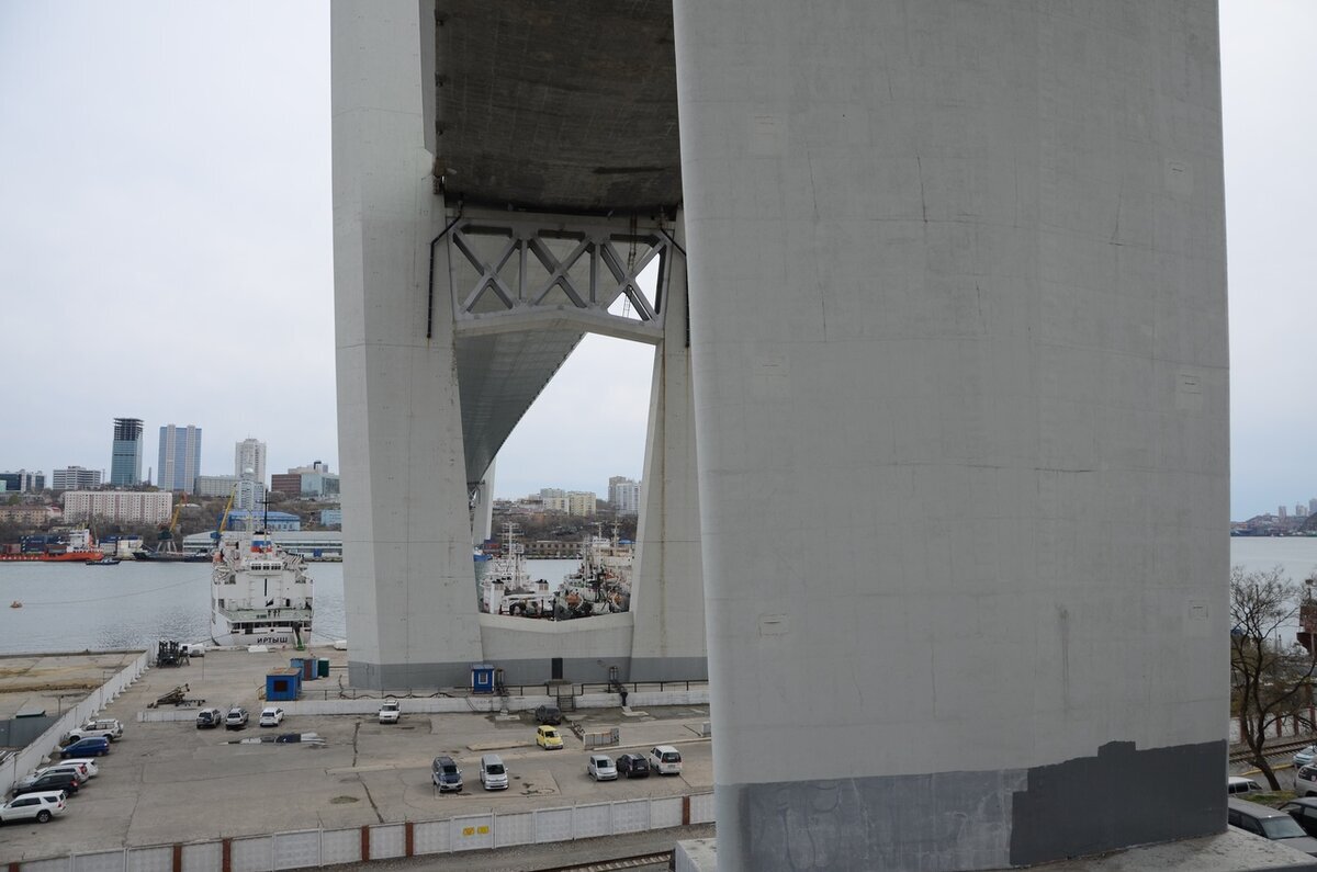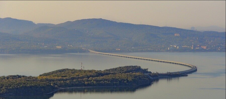 Первый из гигантов - часто теряющийся в тумане низководный мост через Амурский залив. Самый нефотогеничный из трёх мостов, осознать его размеры можно разве что из иллюминатора самолёта. До недавнего времени он был вторым по длине (4364 метра) мостом России - после Ульяновского моста через Волгу.