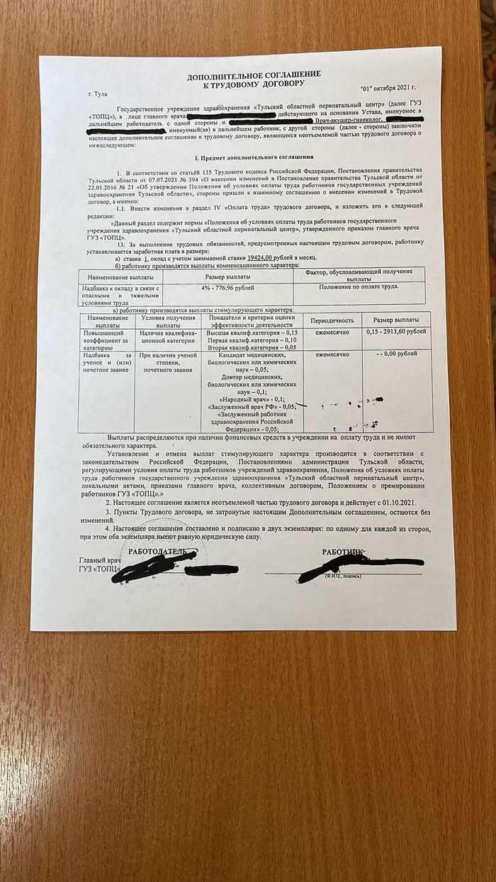 И хлебнула откровенного г...грязи. В том посте я выложила официальный документ реального врача акушера-гинеколога (дополнительное соглашение к трудовому договору от 1 октября 2021 года). Там написано, что оклад у врача 19 424 рублей (девятнадцать тысяч четыреста двадцать четыре рубля), что надбавка за высшую категорию (10+ лет стажа, постоянные повышения квалификации и экзамен перед комиссией, чтобы получить) 15% - это 2 913,60 рублей (две тысячи девятьсот тринадцать рублей шестьдесят копеек). Реальный документ "Тульского областного перинатального центра" (я его продублирую в конце поста, чтобы все его видели и не говорили, что я что-то придумала).