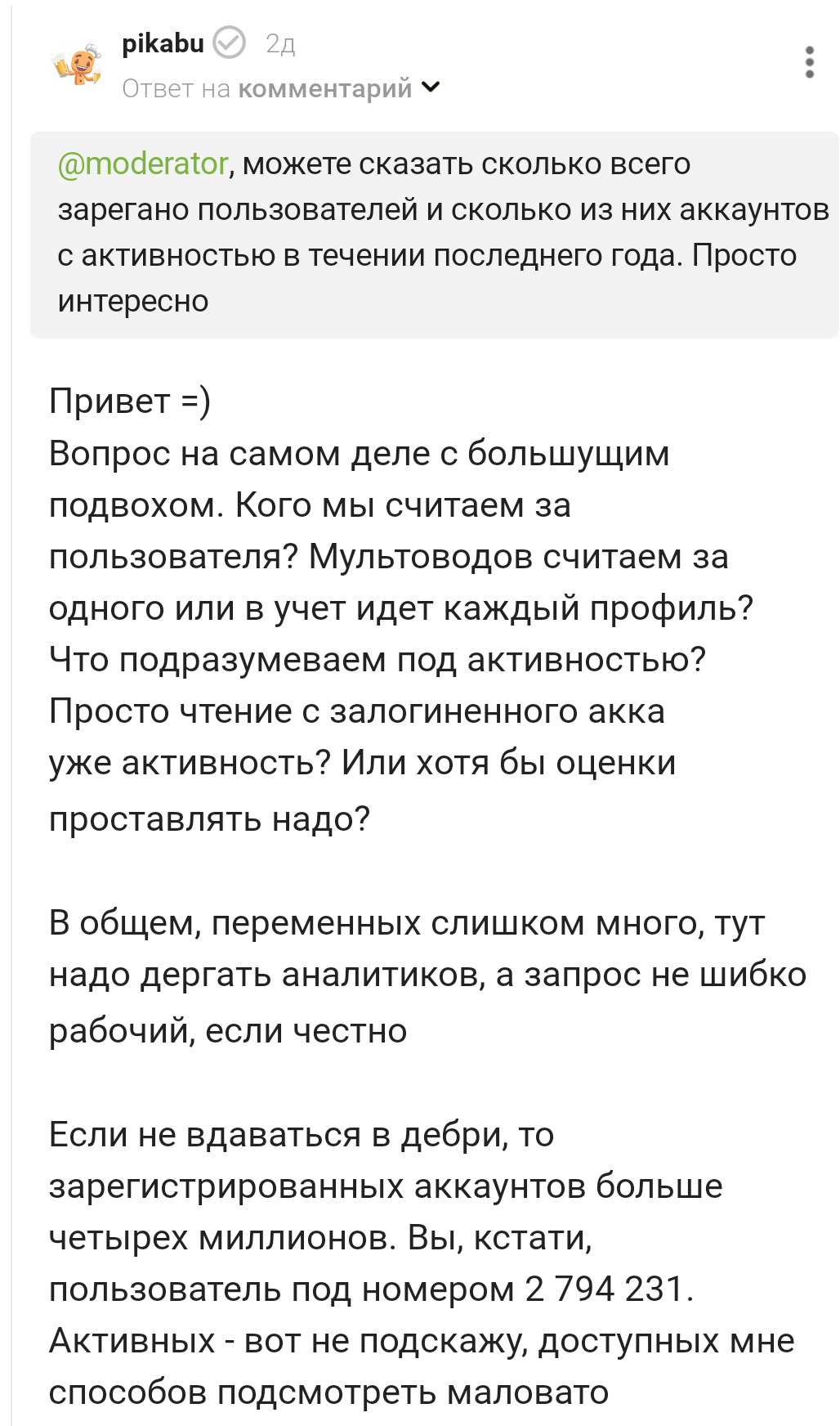 Столько постов было про пикабушников: и встречи, и помощь разная, и бесплатные услуги и много ещё чего нужного, ну и естественно посты интересные!!! И тут мне стало очень интересно и решил спросить напрямую @moderator, Сколько нас? ответ ниже на картинке)) всем благ.