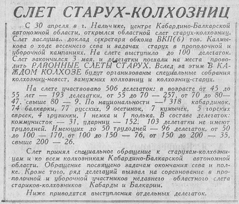 Нельзя сказать, что это было очень длительное и заметное явление, но та заметочка про "слёт старух-колхозниц" является частью страницы газеты "Известия". Страницы, которая целиком посвящена именно теме работающих стариков.