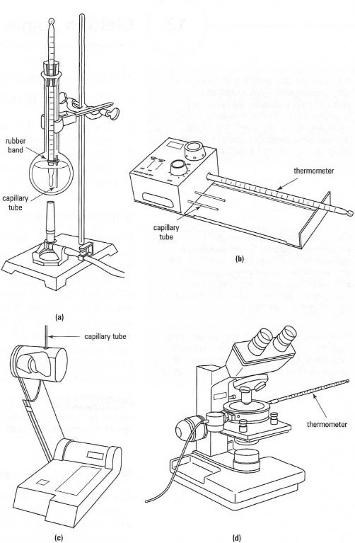 Выглядит это так: мы берем запаянный с одного конца капилляр, набиваем его на 3-5 мм веществом, вставляем в дырку в нагревательном блоке и смотрим в окуляр сбоку. Прибор медленно повышает температуру, а мы следим, когда вещество расплавится. На более продвинутых моделях, кроме этого, есть детектирование по преломлению лазерного луча и запись видео. Однако вживую всё равно выходит точнее и надежнее.