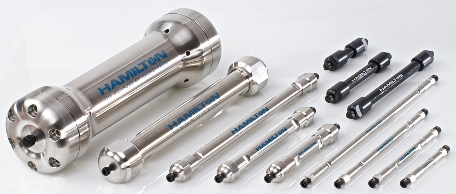Колонки для ВЭЖХ совершенно непохожи на ГХ-шные. Корпус из сверхпрочного пластика, нержавеющей стали или даже титана - чтобы держать сотни бар, длина от 10 до 25 см (обычно, бывают и исключения), внутреннее сечение - миллиметры или сантиметры, никаких изгибов. На входе и выходе - титановые сеточки. Для анализа обычно используются колонки с сечением до 2.5 мм. Всё, что толще, так или иначе служит для препаративного разделения.