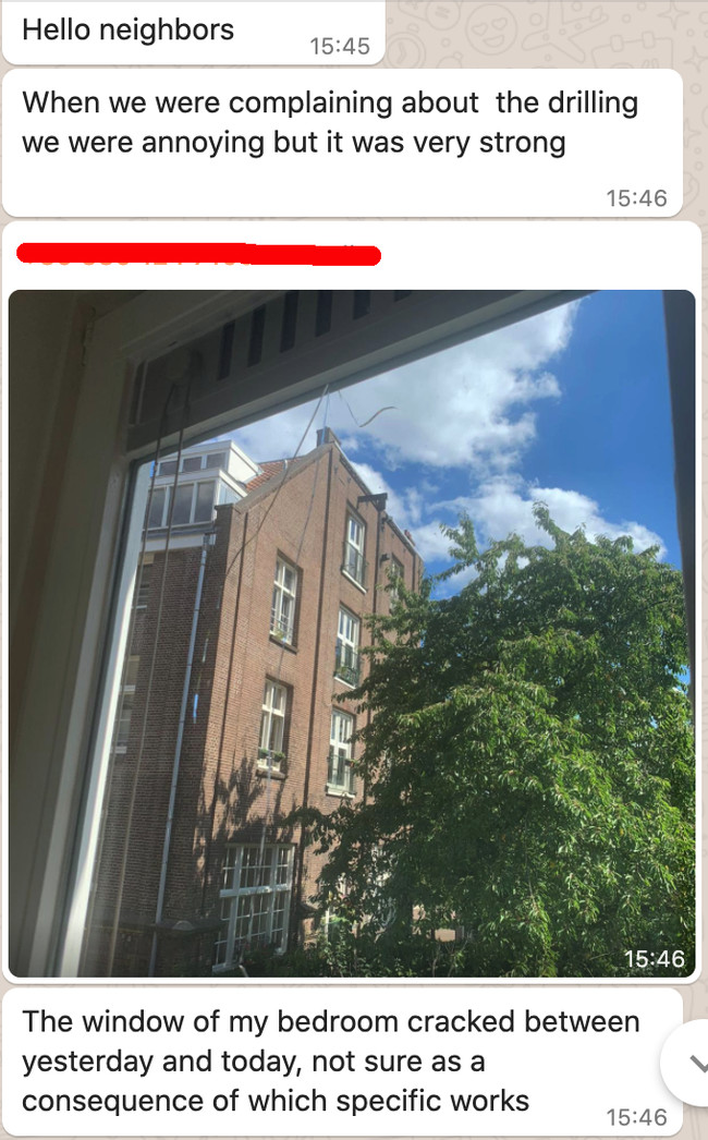 "Привет, соседи. Мы уже всех достали жалобами на перфоратор, но шум был очень сильный. Окно в моей спальне лопнуло между вчерашним и сегодняшним днем, не уверен, из-за чего конкретно."