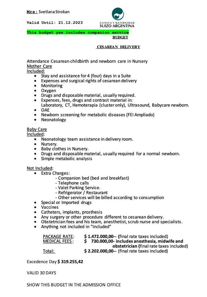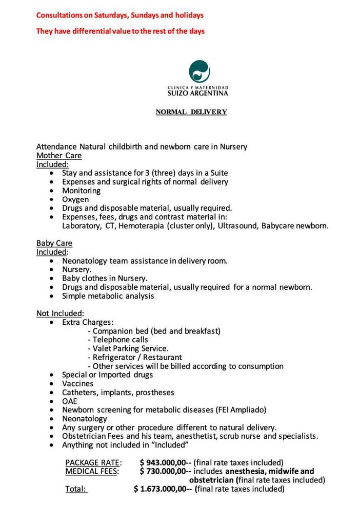 Прайсы на естественные роды (фото 1) и на кесарево (фото 2). Так как песо скачет, то цену закрепили за мной ту, что на фото. Это был ноябрь. А рожала я в декабре по старой цене. Мои естественные роды встали около 1200 $ по блю курсу