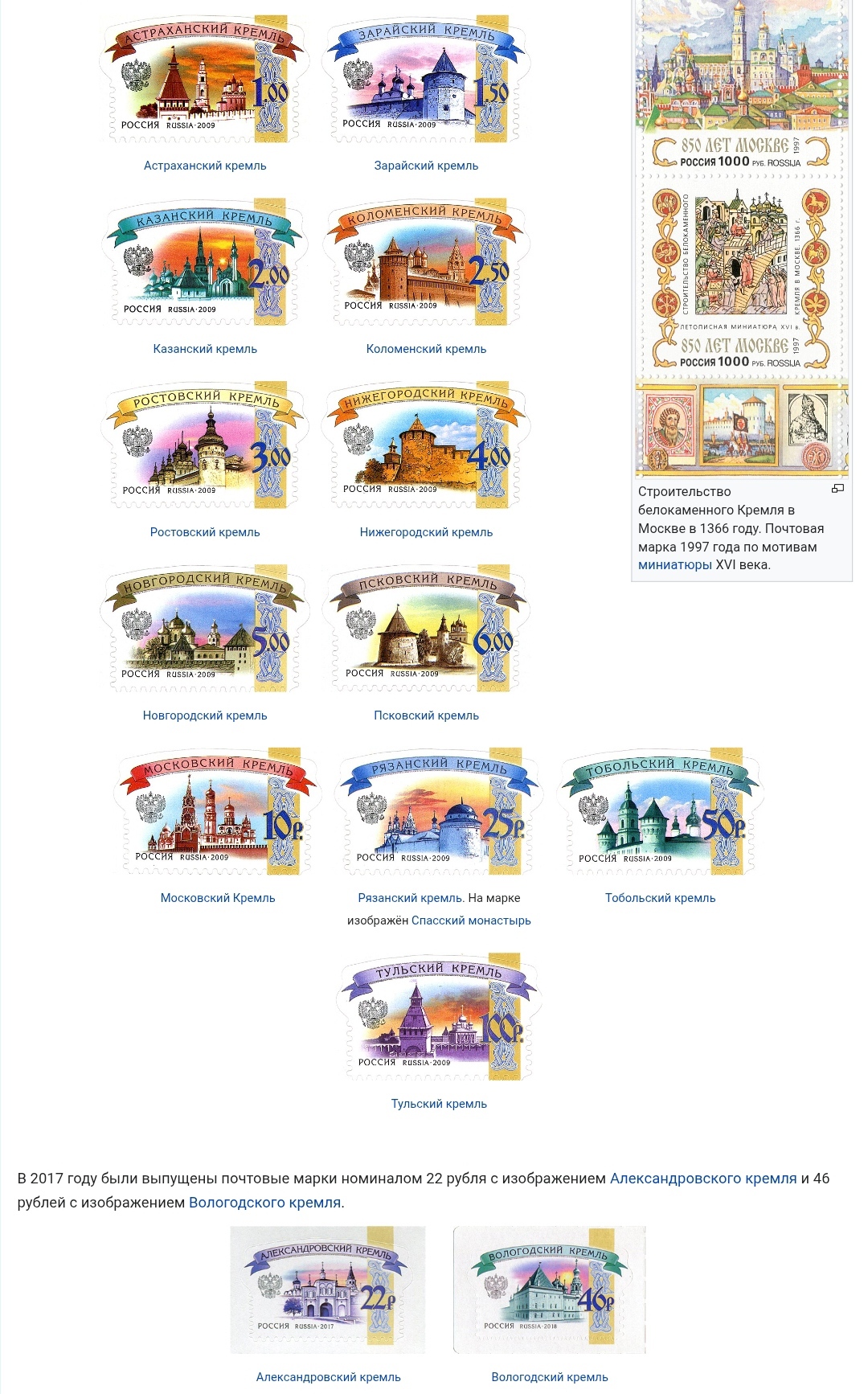 Ранее для обозначения использовалось слово детинец. Ответ на вопрос из заголовка поста может быть разным, в зависимости от степени сохранности объектов. Самая часто встречаемая цифра это 12 кремлей. Так, в 2009 году поста России выпустила серию марок посвященных кремлям разных городов страны. В 2017 году были выпущены еще почтовые марки с изображением Александровского и Вологодского кремля.