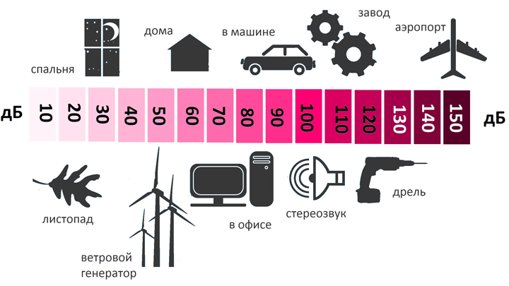 На диаграмме видно сколько дБ шума разносится от разных источников.