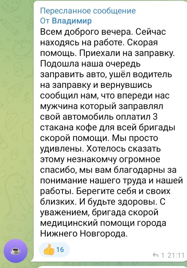 Как то на пикабу в лучшем, прочитал пост про добро для скорой помощи на заправке. Автор купил кофе для всех сотрудников машины.