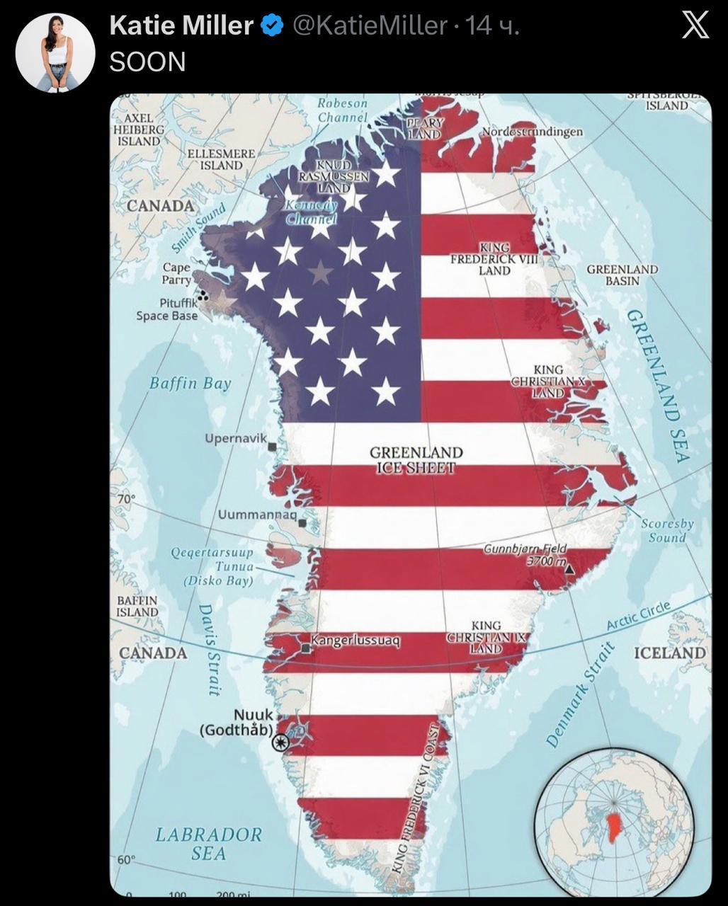 25 Inquabator Баяны Скоро 13 дней назад Супруга замглавы аппарата Белого дома Кэти Миллер выложила в своих соцсетях карту Гренландии, окрашенного в цвета флага США, с подписью «скоро». США Политика Третья мировая война Беспредел Гренландия Венесуэла 6 1 Ещё 0