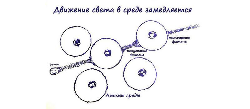 Каждый второй комментатор лекций про скорость света обязательно блеснет знаниями о том, что скорость света бывает медленной. Да, всё верно, но это происходит, когда свет распространяется в какой-то среде, например, в воде - на 25% медленнее, чем в вакууме. В этом случае свет по цепочке поглощается атомами вещества, через которое летит, и испускается дальше – на всё это тратится некоторое время, отчего мы и видим, как все замедленно и банально.
