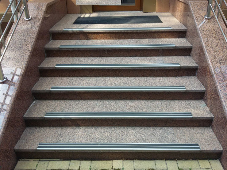 Собственно по этому на ступенях, особенно ступенях из керамической плитки или гранита устанавливаются прорезиненные накладки. Каждый из вас их видел. Узкий профиль, внутрь которого вставлена резиновая полоса. Пустяк казалось бы, а человеческую жизнь бережет.