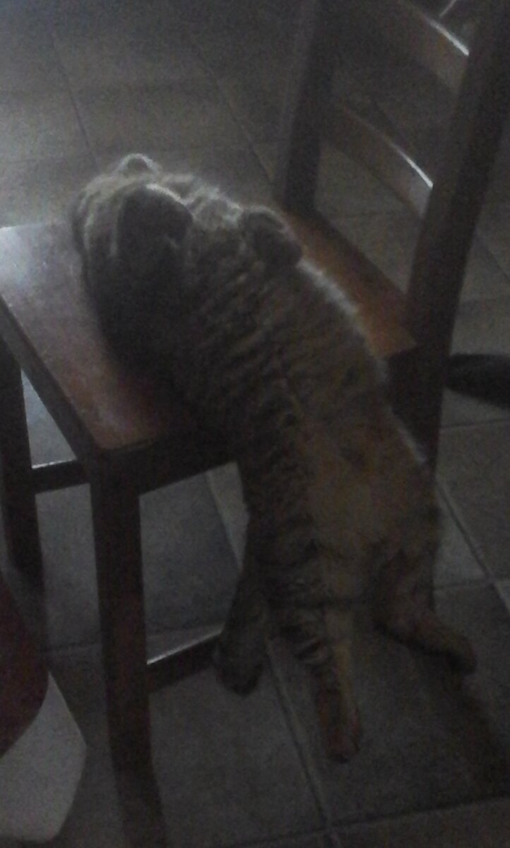 Так пережил он зиму, началась весна, а с ней вместе началась битва за Мордор. Кот стал приходить домой раз в два-три дня, поначалу мы переживали, а потом махнули рукой - он просто бился с другими котами за право наплодить очередную порцию таких же толстомордых котят. Возвращался в коматозном состоянии и падал без чувств отсыпаться, и однажды мы застукали его спящим вот в такой позе: