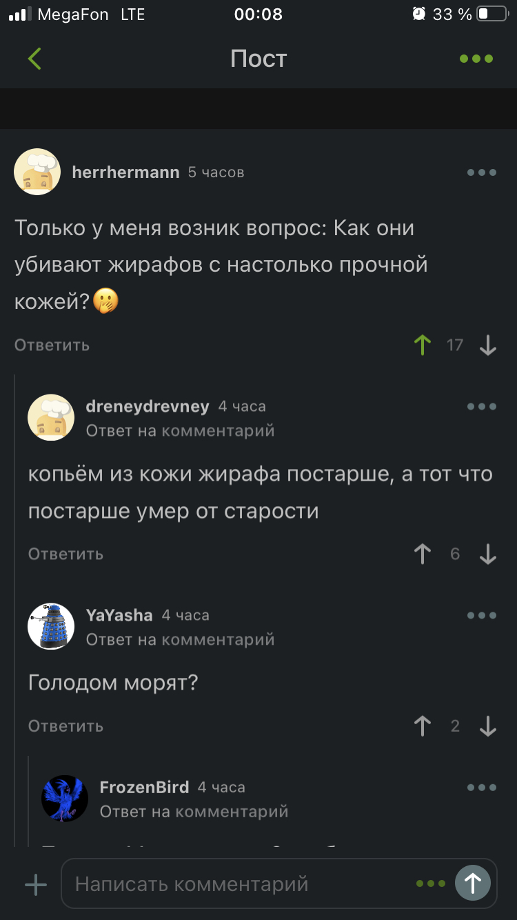 tnfsyaru Скриншоты комментов 3 года назад @dreneydrevney, @herrhermann, вы в телевизоре! Кожа жирафа очень прочная Комментарии Жираф Скриншот Комментарии на Пикабу Ещё 0