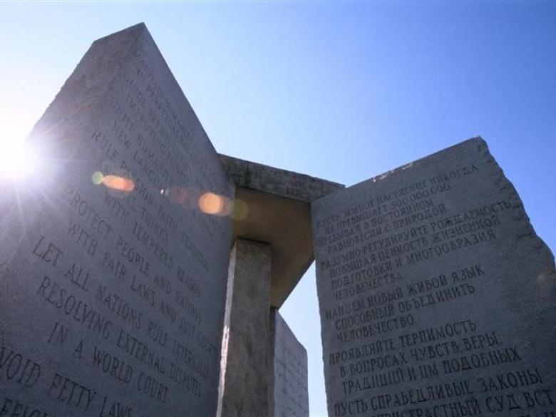 Этот монумент в штате Джорджия содержит инструкции о том, как восстановить общество после апокалиптического события, на 8 разных языках. Он также функционирует как компас, календарь и часы.