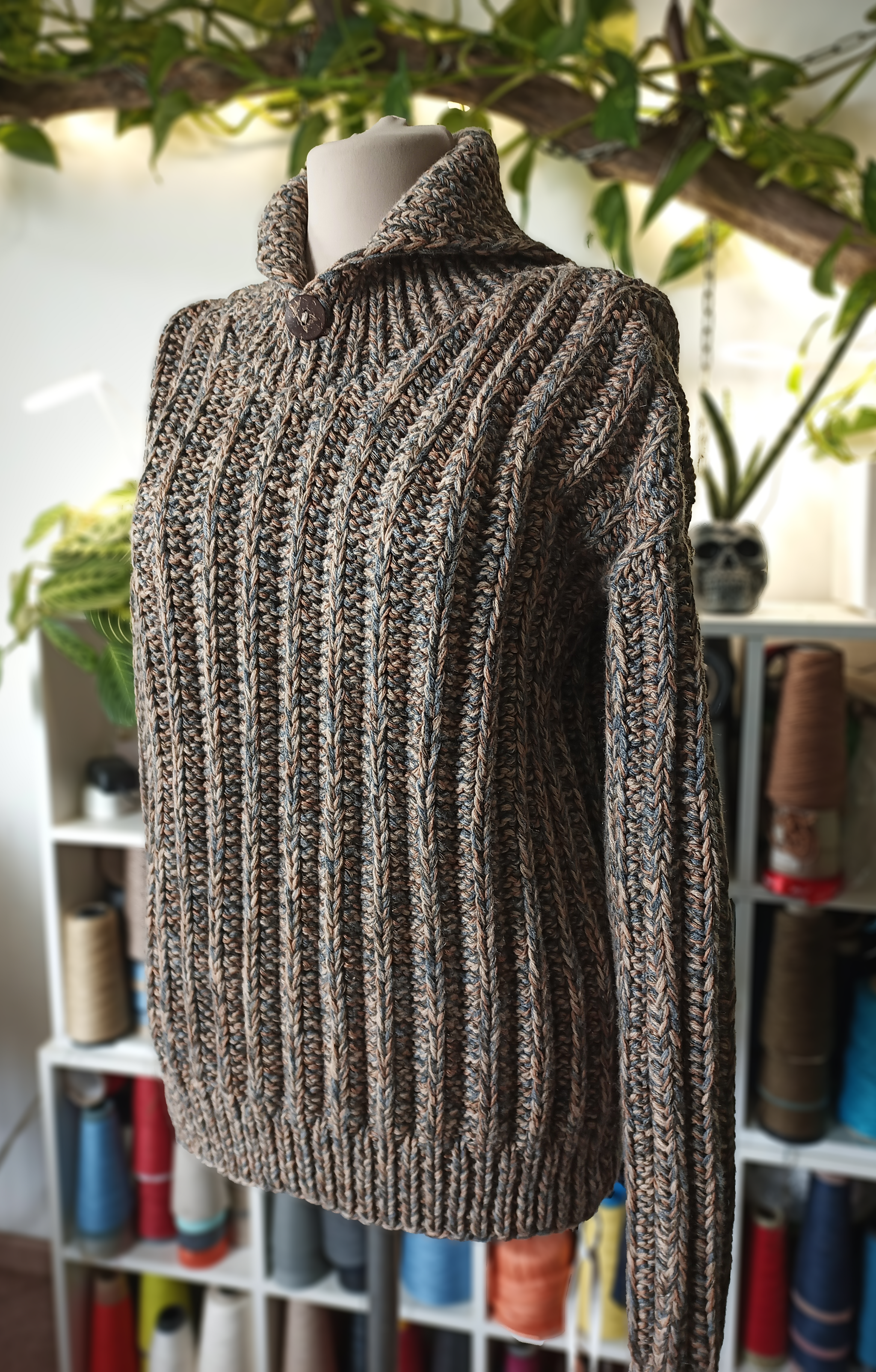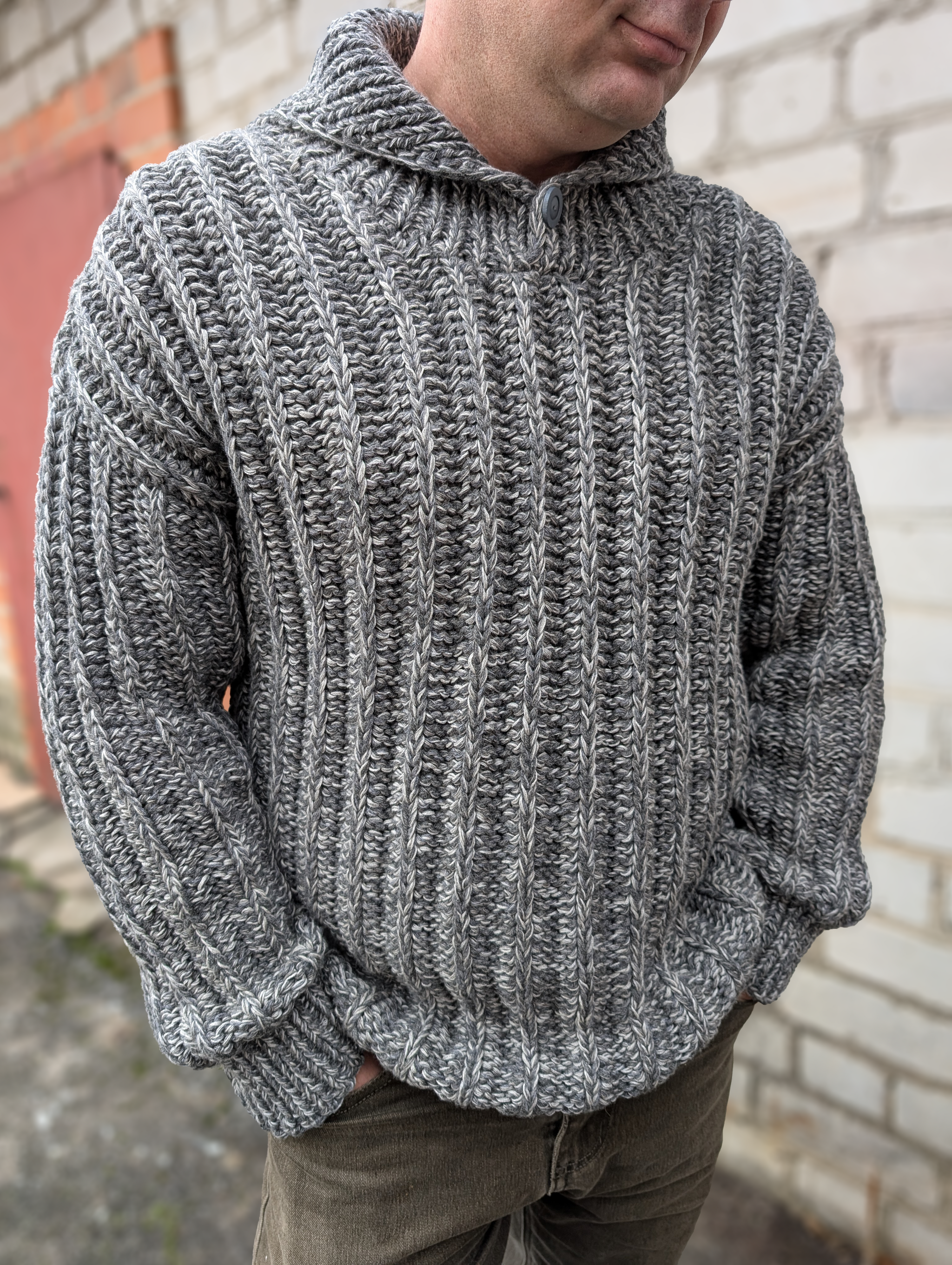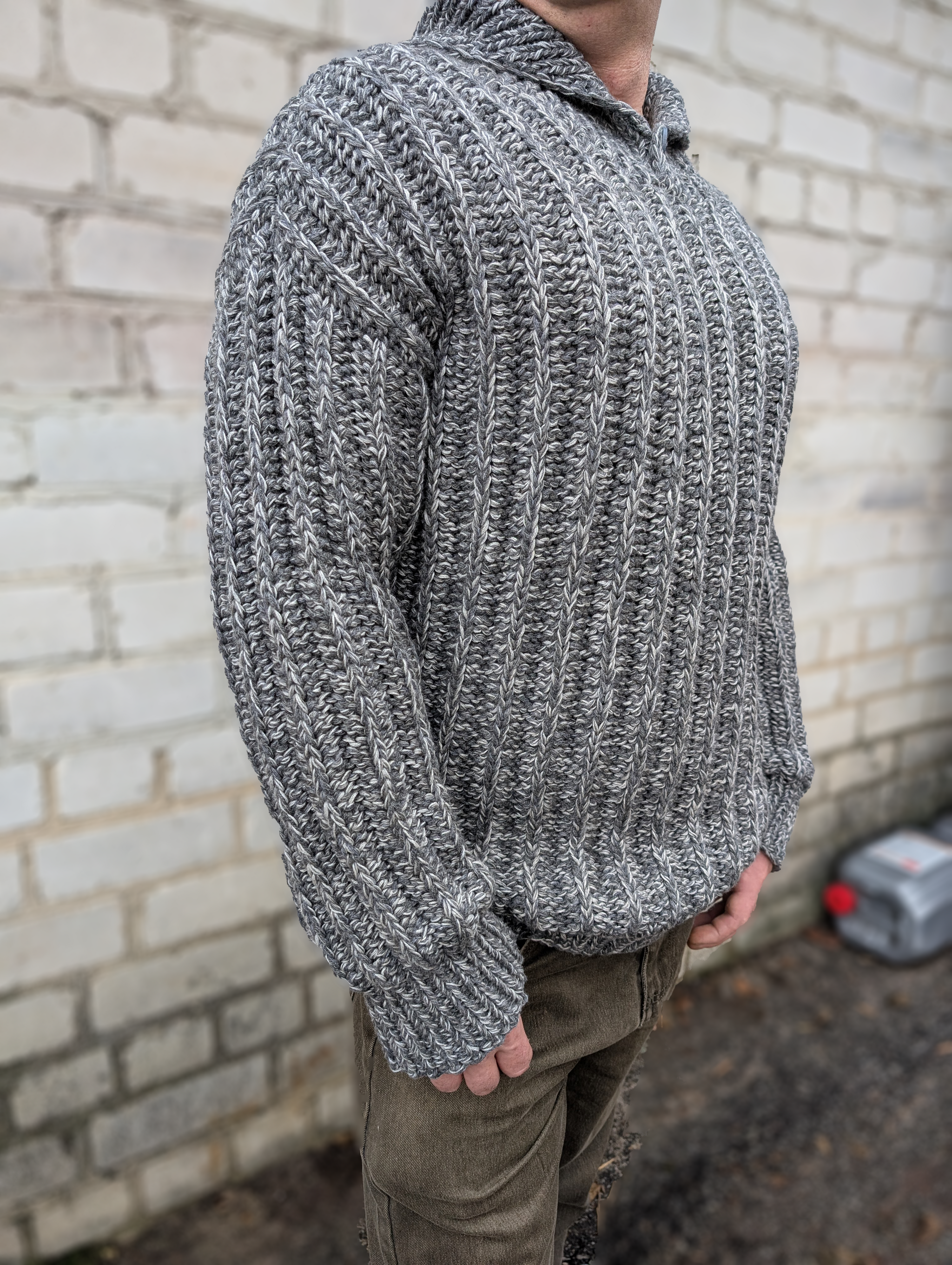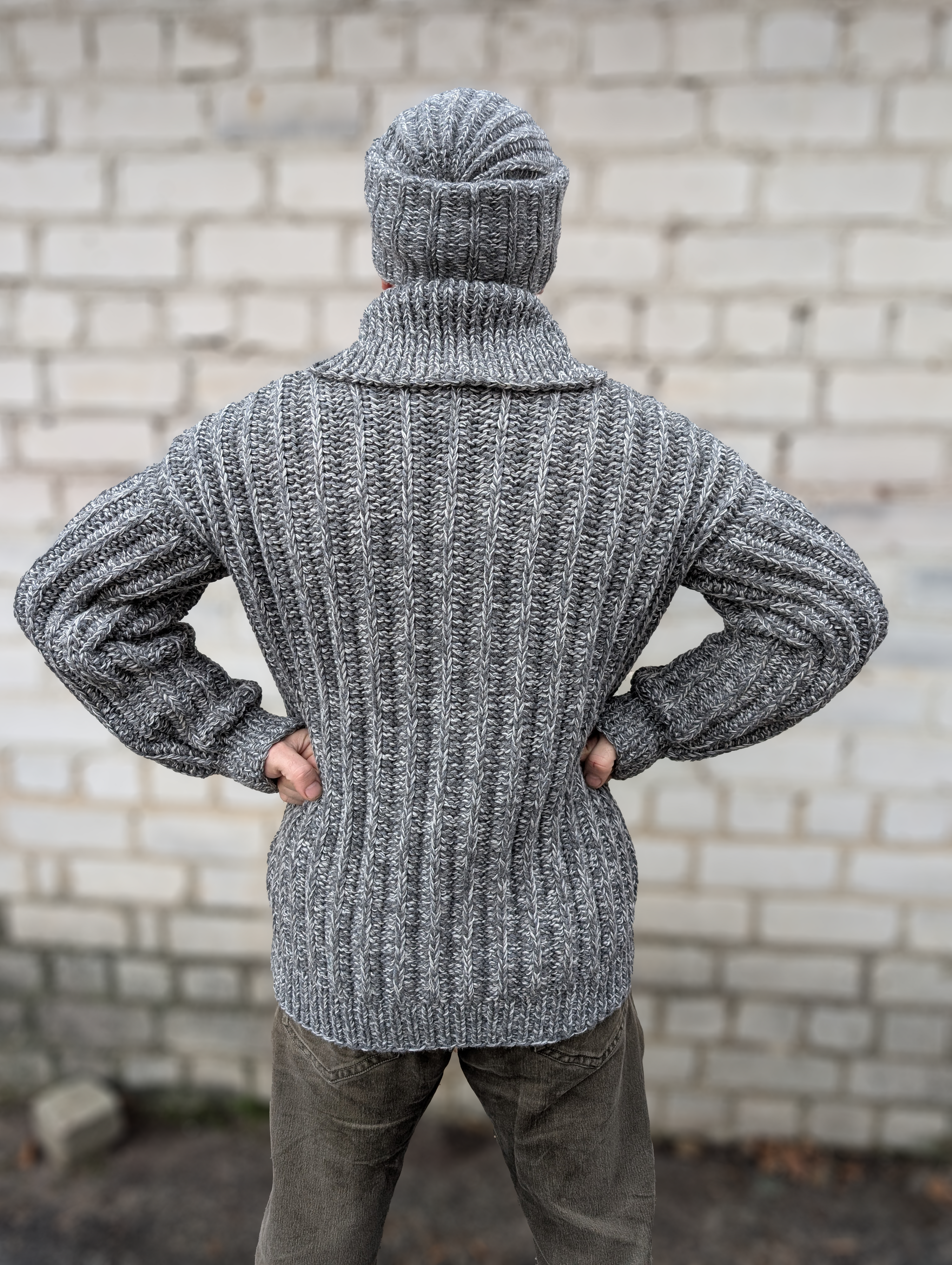 Начну со свитера из фильма Брат. Попросили сделать в сером цвете, на самом деле их было 2, но они одинаковые. За основу использовала шерсть ягненка английского производства от Z Hinchliffe & Sons Ltd 850м/100гр в 3 нити вместе с ягненком от итальянского производителя PAPI FABIO Silte 1/15 1500 м/100гр тоже в 3 нити. В подмот брала хлопок и лен общей толщиной 333м/100гр для того, чтобы этого ягненка можно было стирать в машине и он не садился. Плюс это удешевляет стоимость пряжи, дает хорошую воздухопроницаемость, а значит в очень теплом свитере вы не потеете из-за свойств льна и хлопка - хорошей впитываемости и терморегуляции. На обхват груди 105 и блине 75 см общий вес свитера составил 1580 гр. Вязала на спицах 5,5 резинки основное полотно на 6. Из остатков пряжи по просьбе парня связала шапку из остатков, но более тонкую. Если вязать шапку такую же толстую, как свитер - на голове будет неэластичное ведро. Шапку подваляла руками при стирке, чтобы лучше защищала от ветра.