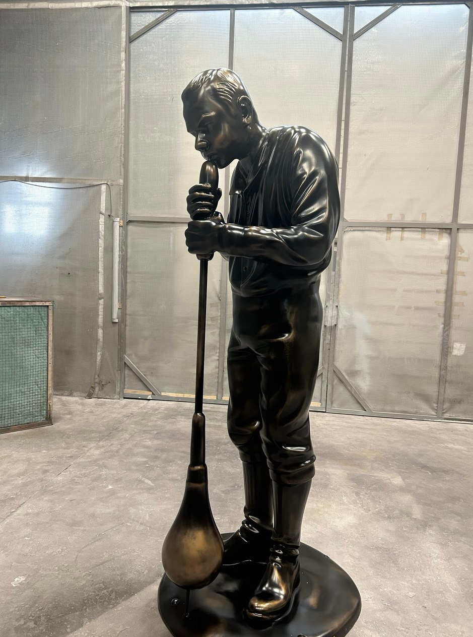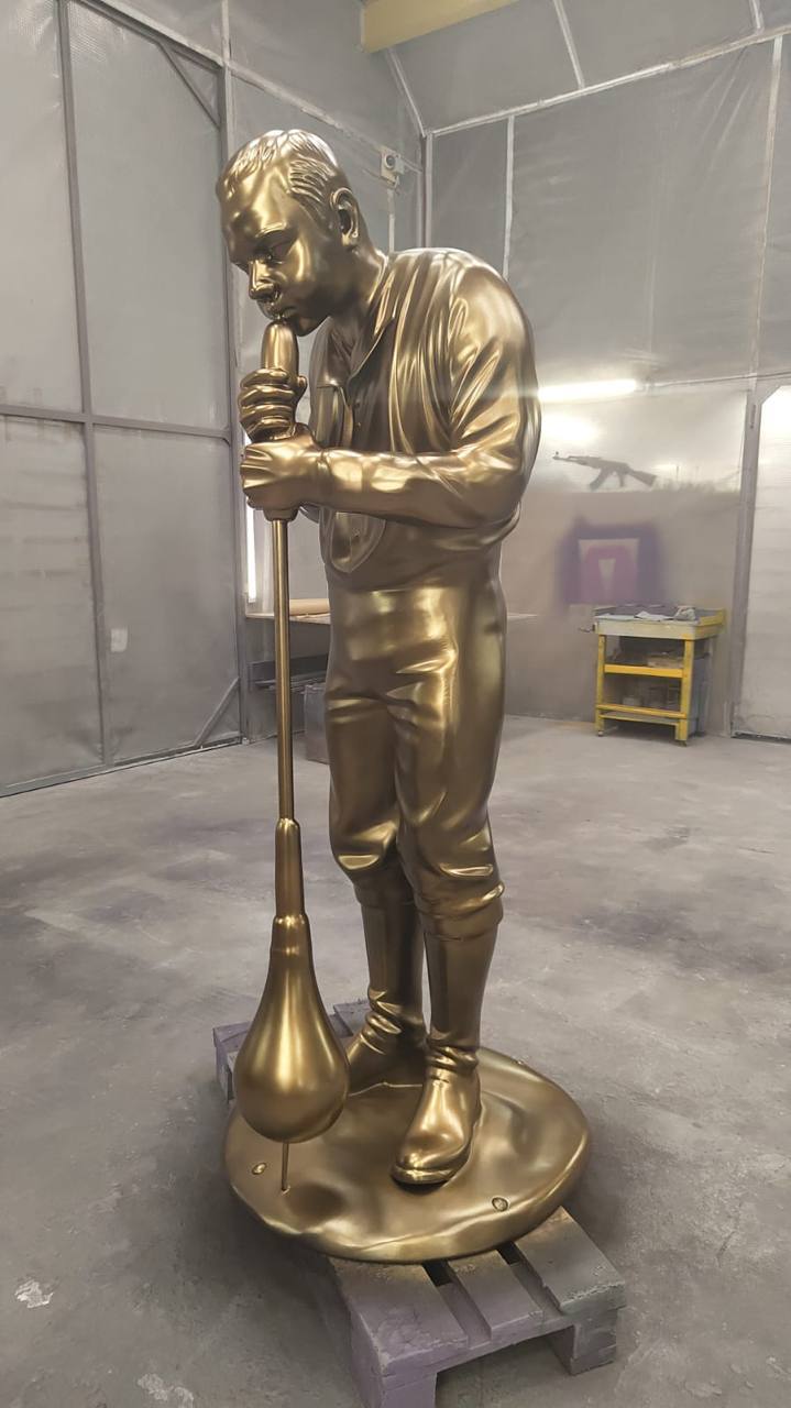 Так как скульптура уличная, мы ее должны сделать из стеклопластика с покраской под бронзу. Почему не саму бронзу? Бронза в 4-5 раз дороже, поэтому сейчас уже многие скульптуры делаются из него, потому что украшать города и поселения всем хочется, а бюджеты не позволяют это сделать из бронзы.