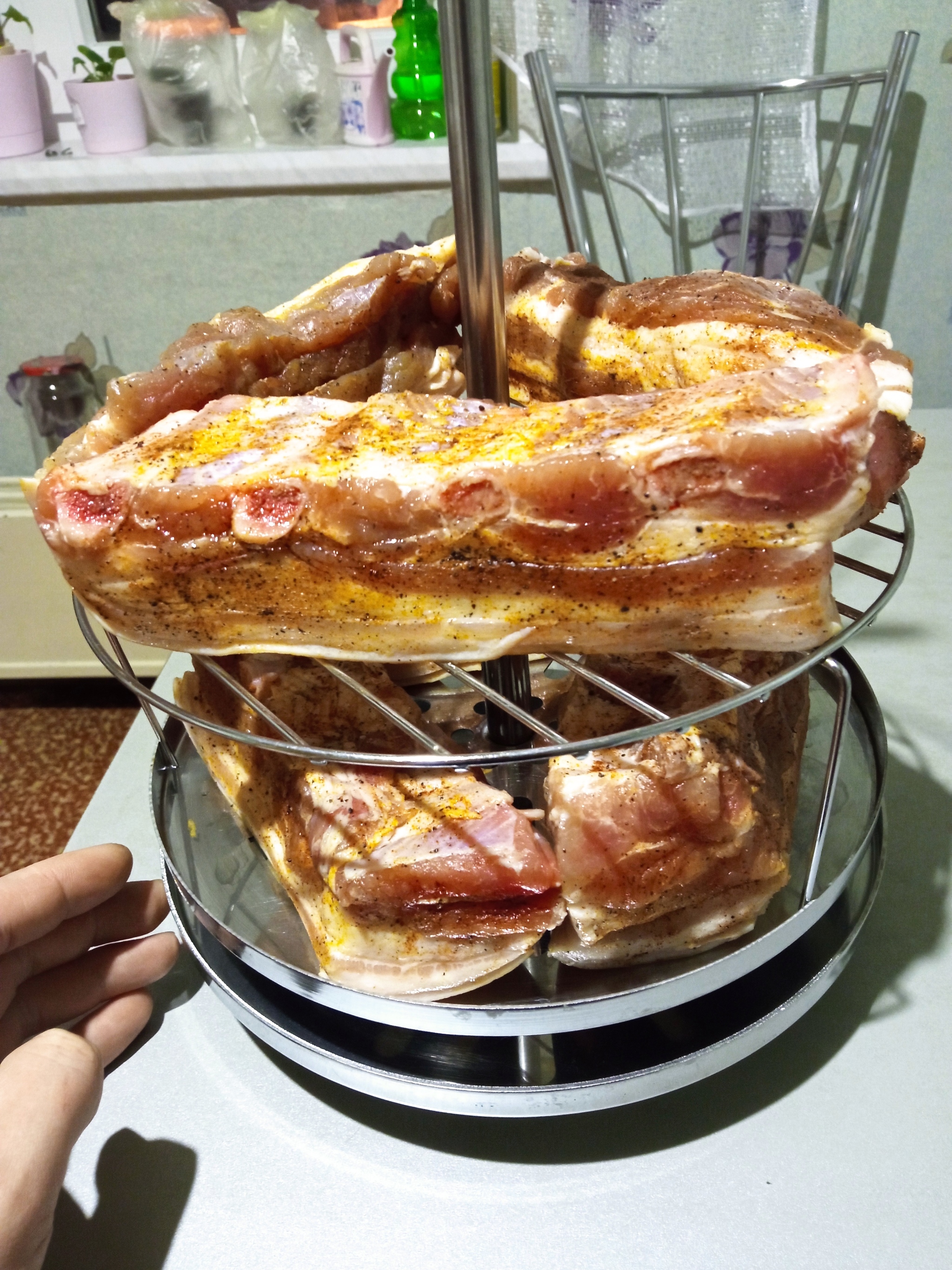 Вяжется для сохранения формы и удобства. Рыба за петельку подвешивается вниз головой, т.к. жабры могут давать горечь. Вялил около 3 часов.