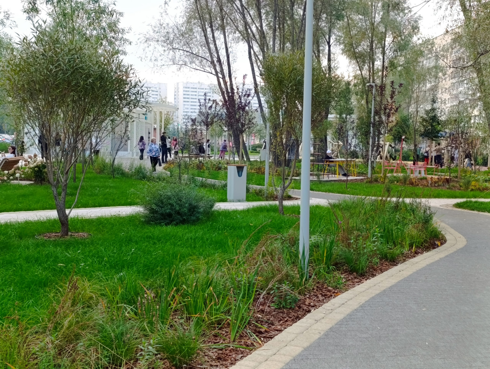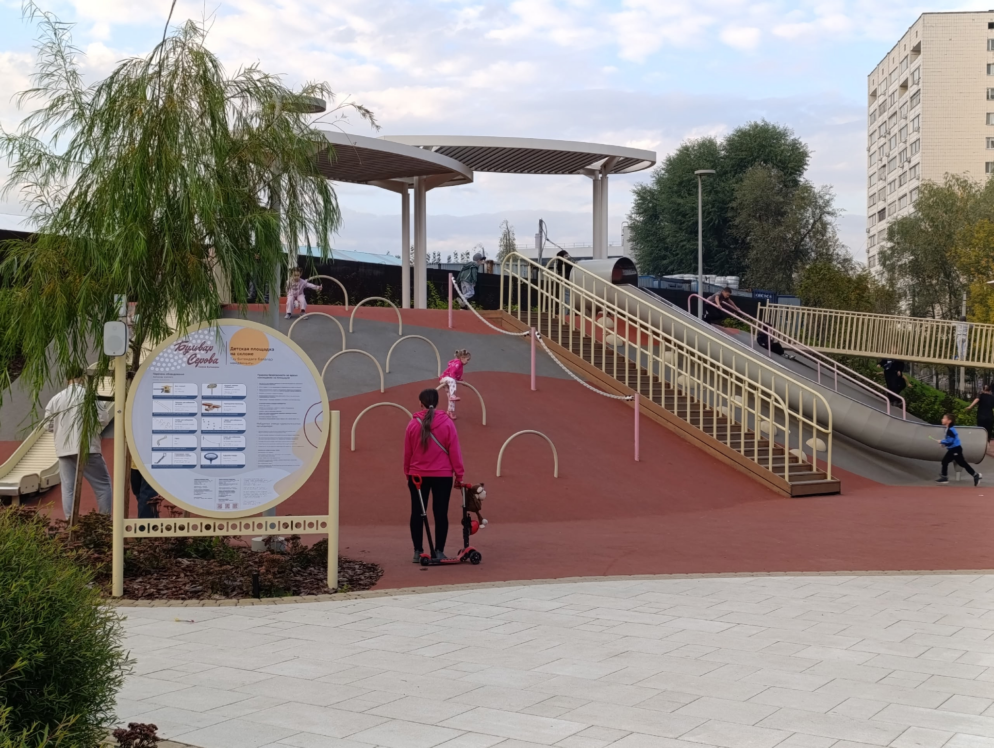 Детские площадки, шахматные столы, велодорожка и прокат специальных велосипедов, высокие клумбы для общественного огорода - все доступно для людей с ОВЗ.
