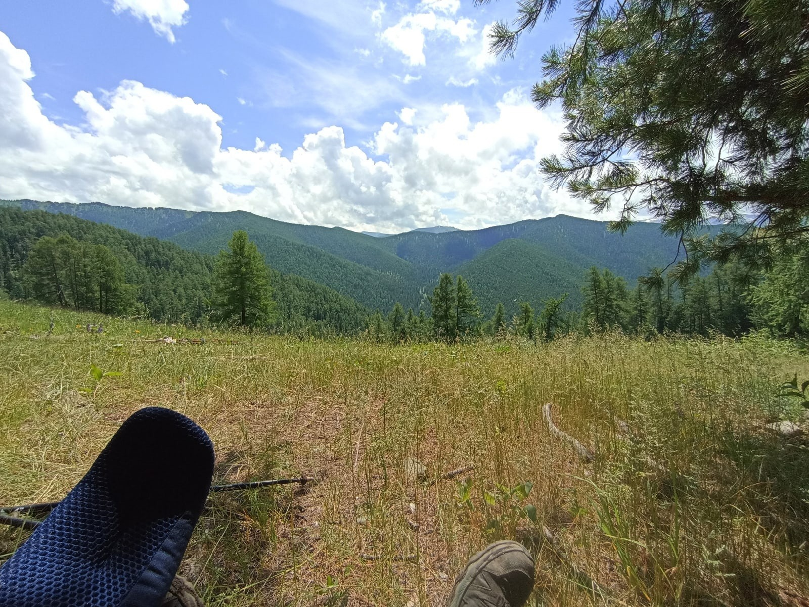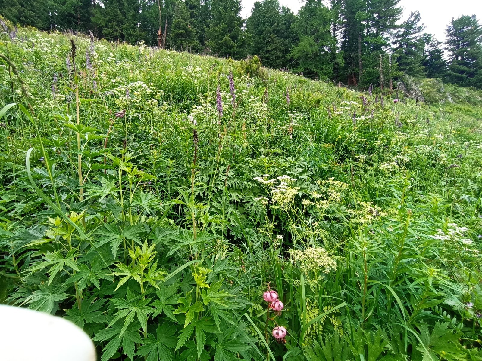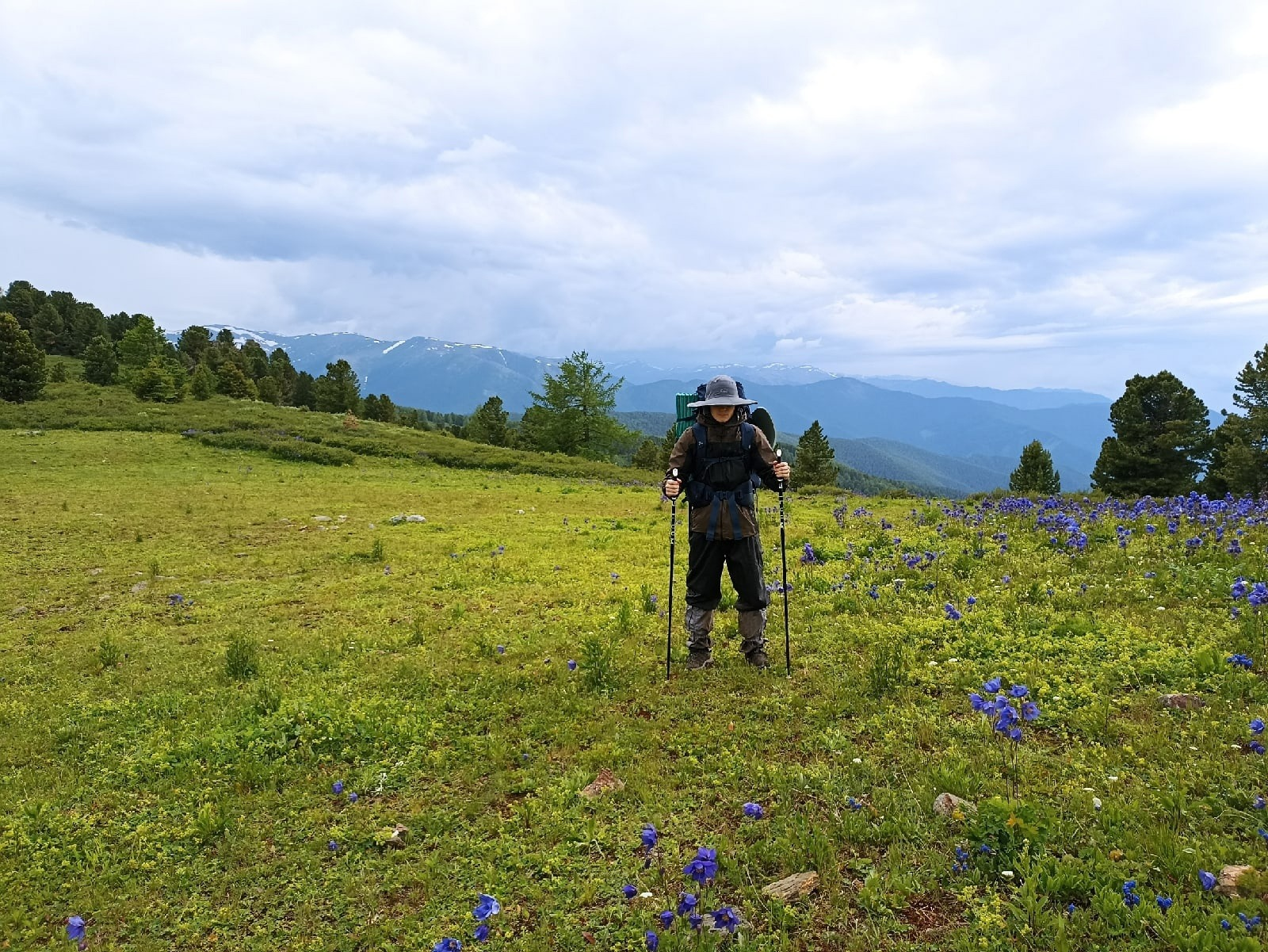 После леса нас ждало отсутствие тропы, ибо она полностью заросла. Пришлось идти примерно по направлению. Такое передвижение тоже было весьма затруднительно. Из-за неимения видимости земли под высокой травой моими спутниками были регулярные подскальзывания на грязи (а там в основном шли траверсом), запнывания об камни и коряги и проваливания в ямы. Когда мы шли в длиной траве по бездорожью, в воздух поднималось броуновское движение насекомых. Некоторое количество которых я успешно съел, я же шёл там полуживой с тяжёлой отдышкой, дышал ртом. Ещё во время этого пути к взору престала сказочная многообразная флора Алтая. Позже выложу отдельно фотографии различных цветов. После моего первого посещения цветочного магазина я понимаю как дофига всё это стоит.