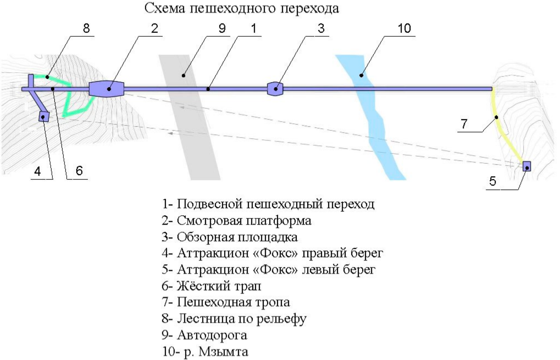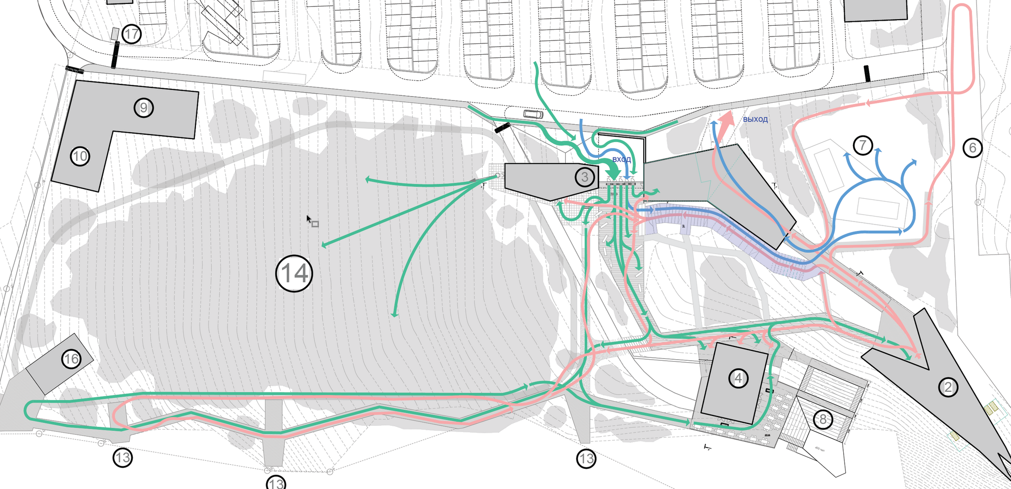 Определив место размещение Пешеходного перехода и террасной автостоянки, был сформирован сценарий восприятия ландшафта. Определены места всех второстепенных объектов. Мы связали их пешеходными коммуникациями, согласно функциональному назначению.