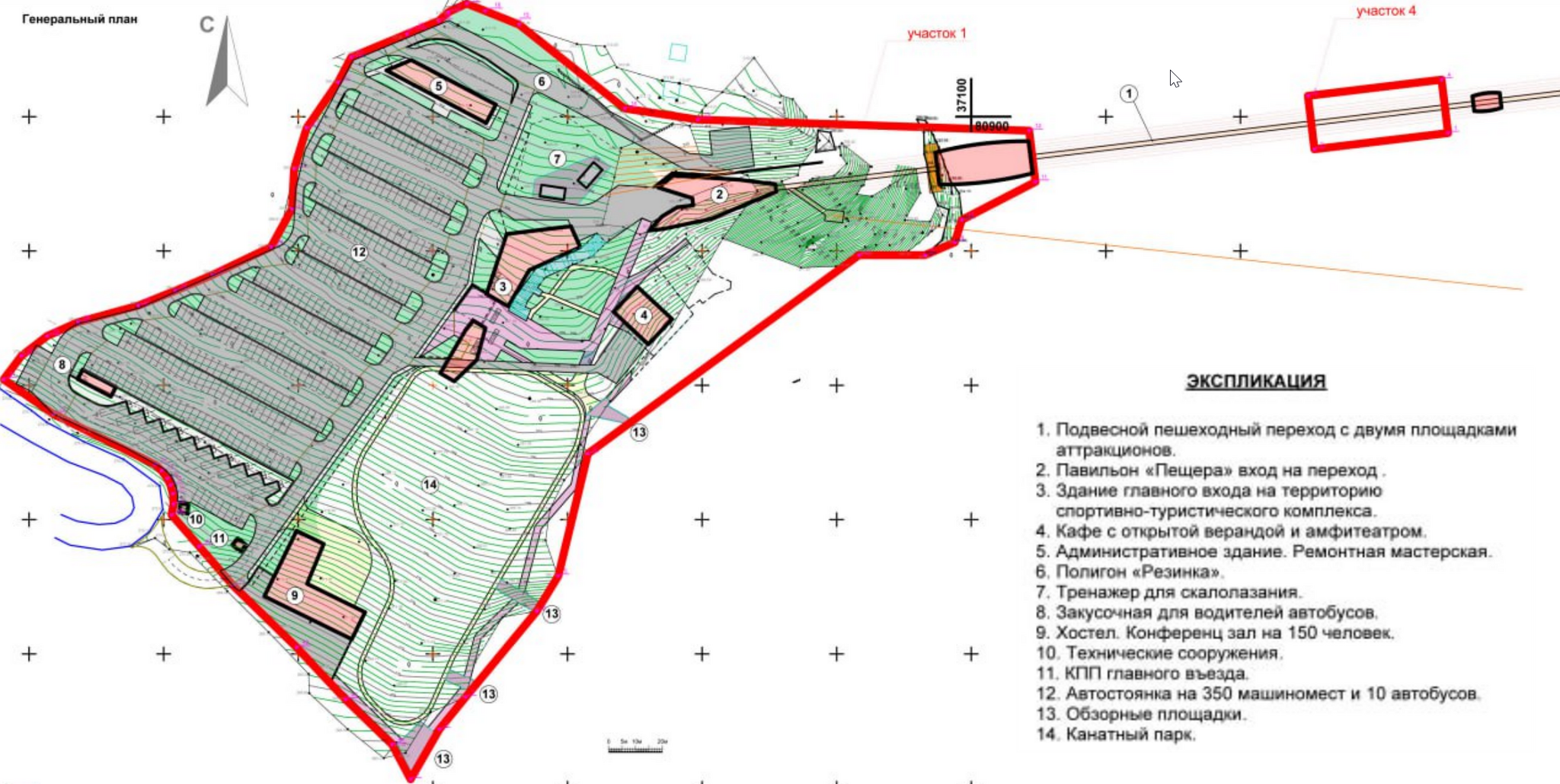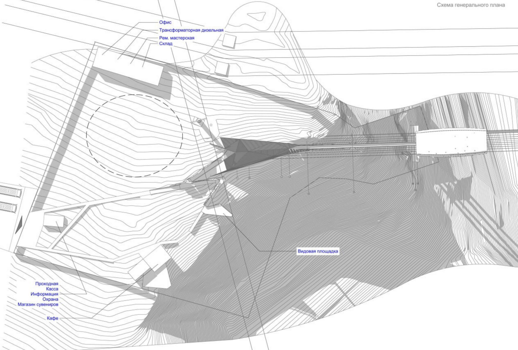 Позже схему усложнили добавив: Здание главного входа, Кафе, Административное здание, Террасную автомобильную площадку, Хостел