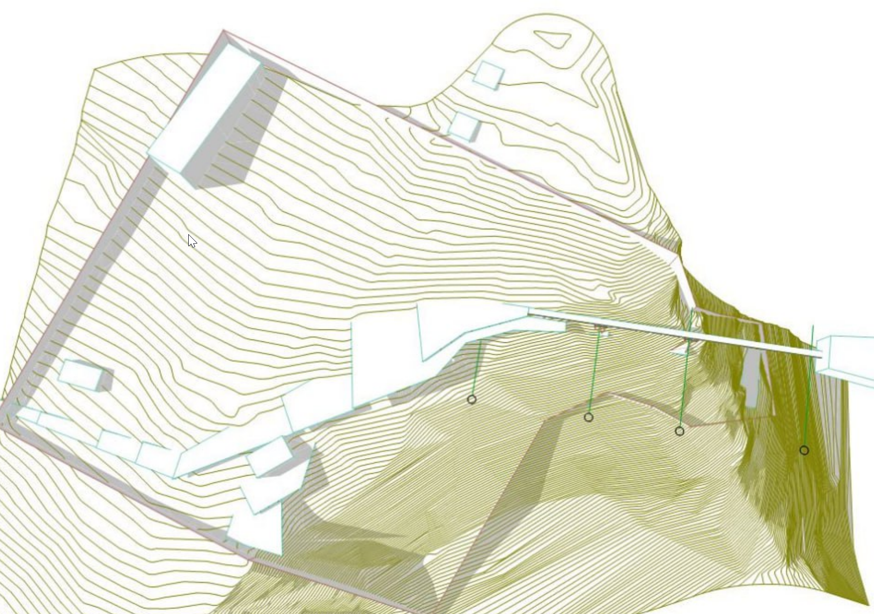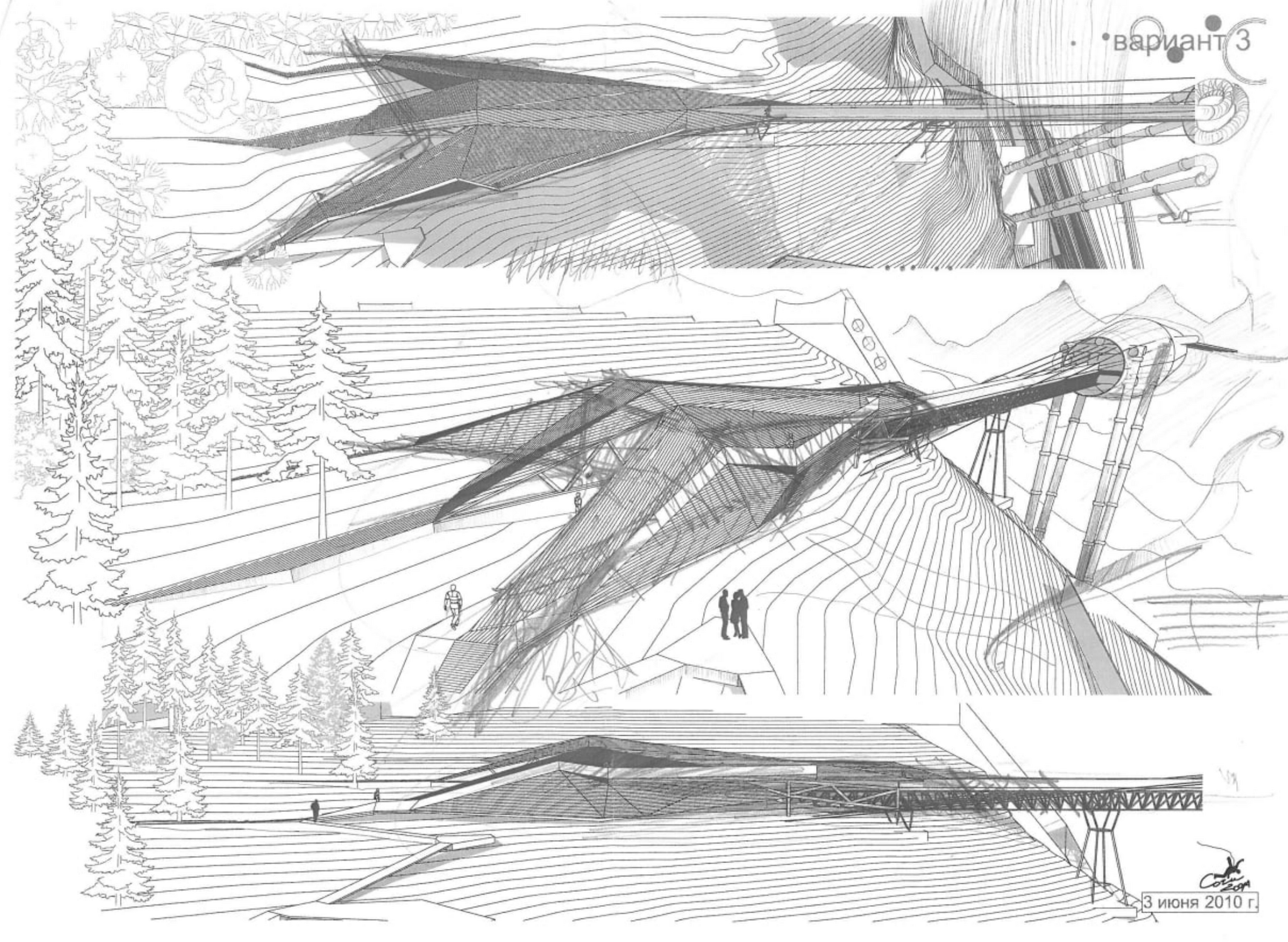 Все здания и сооружения были максимально вписаны в существующий рельеф. Потребовалось выполнить огромное количество эскизов и 3d моделей.