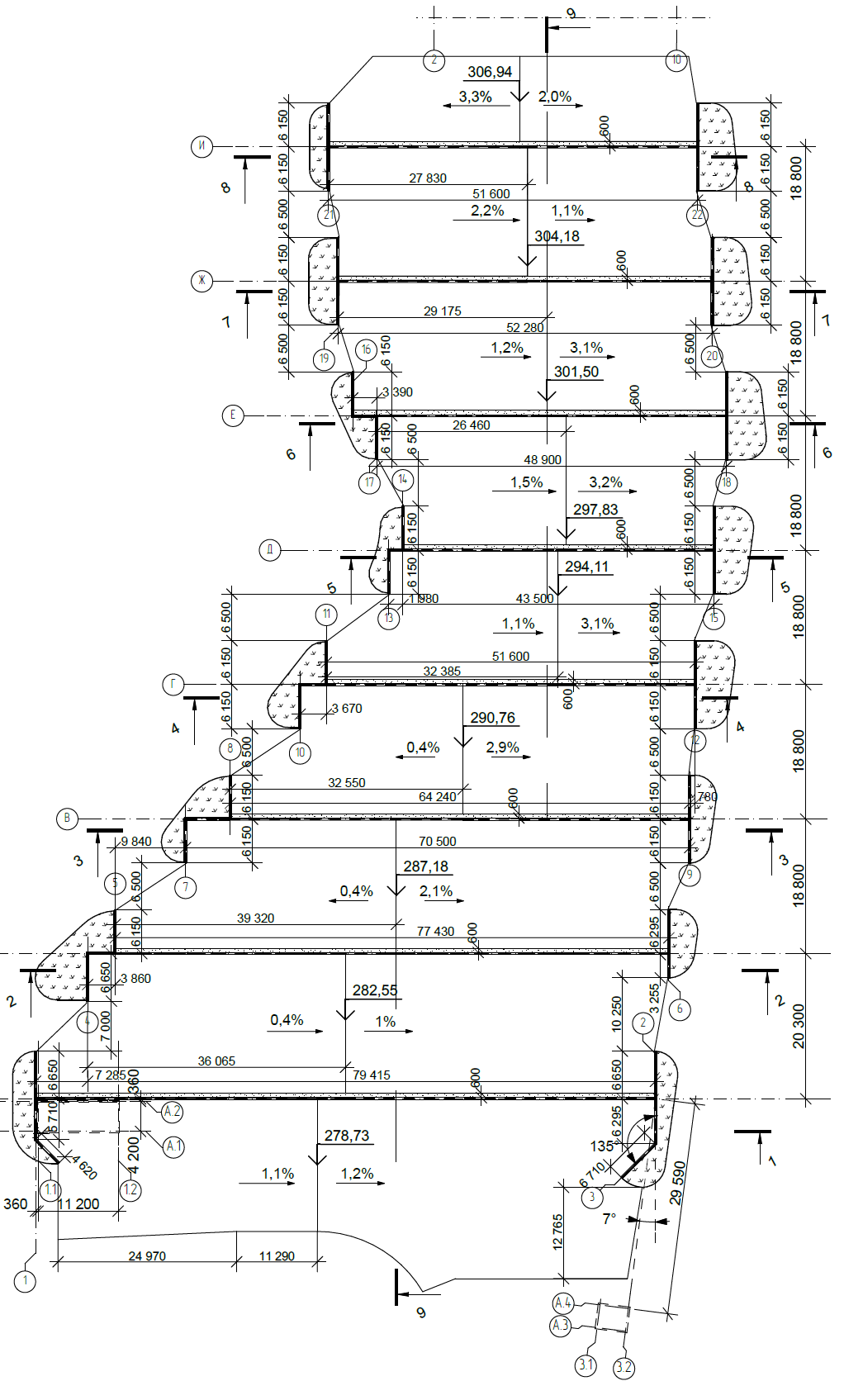 При проектировании террасной автостоянки удалось выдержать все уклоны и требования. Сложность была в активном рельефе, размерах машиномест и проездов. Привозить и подсыпать грунт, не было возможности - можно было только максимально используя рельеф, незначительно перемещать массы для выравнивания.