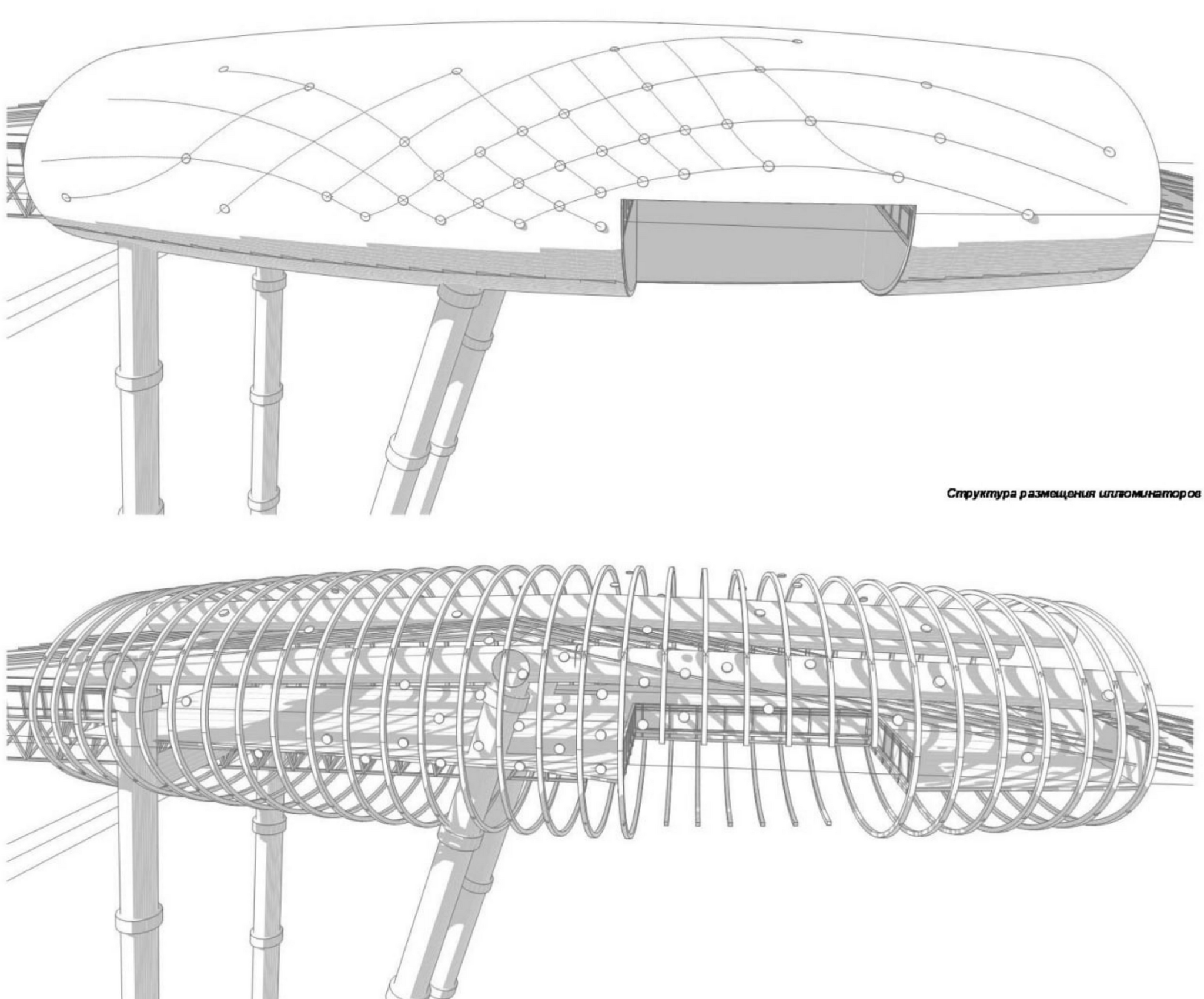 Конструкция смотровой площадки представляет из себя кольцеобразные структуры закреплённые на основном несущем каркасе. Между этих колец натягивались полосы из ПВХ ткани.