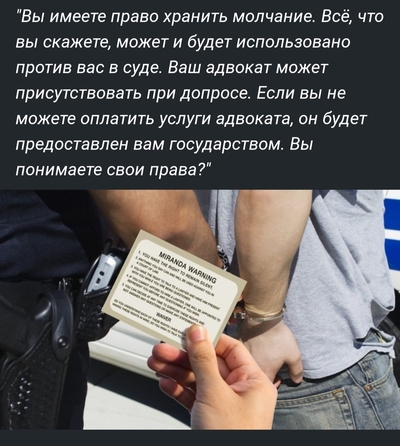 Миранду зачитывают, когда с задержанным начинают вести процессуальные действия. На канале "Грани Заката" Михаил Лапидус рассказывал об этом. Пока ты везешь задержанного или арестованного в участок - ты не допрашиваешь его. Все о чем вы разговариваете до зачитывания прав - это просто беседа, неофициальная. Когда человек находится в участке и с ним начинают говорить под запись, тогда конечно ему зачитываются права. Это киношный штамп, что права зачитывают, когда подозреваемый в дорожной пыли валяется. Так, что Вы верно сказали, я просто дополнил.