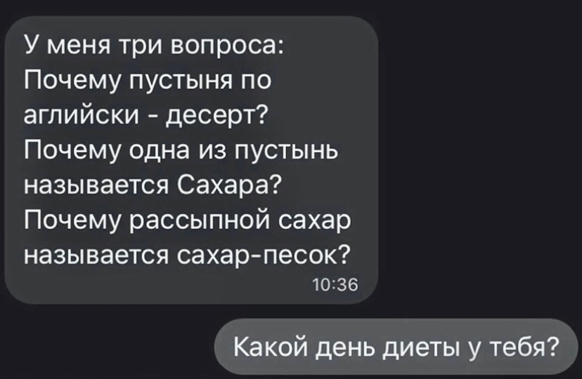 7524 Felikzander 2 года назад «Сладкие» размышления Юмор Сахар Пустыня Повтор Переписка Скриншот Диета Этимология 124 4 4 3 2 Ещё 0