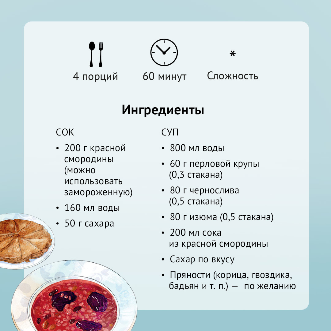 Десертные супы довольно популярны в скандинавских странах, и в Дании, на родине писателя, есть свой любопытный вариант. Его варят на соке красной смородины, который интересен и сам по себе — в качестве освежающего летнего напитка. В Дании он продается в готовом виде, но мы без труда приготовим его самостоятельно из свежих или замороженных ягод.