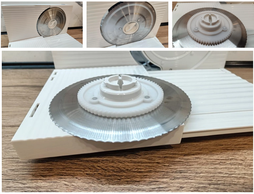 Ломтерезка состоит из 2 частей. Это основной корпус и складная платформа для поддона. На платформе также установлены силиконовые присоски. А в дальнейшем на платформу устанавливается стенка подвижного поддона, поддон и фиксатор продуктов. Корпус выполнен из белого глянцевого пластика, также есть вариант в черном цвете. Но по моему мнению, на белом будет меньше видны следы от эксплуатации и остатки продуктов.