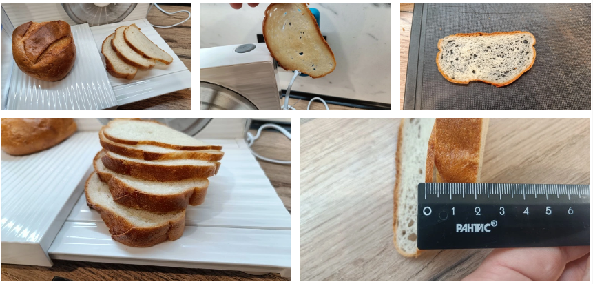 Выставлял различные значения, но тоньше 3 мм мне не получилось отрезать. Очень хороший результат. Хлеб просвечивает через воздушные пузырьки. Максимальная толщина ломтя соответствует 17 мм.