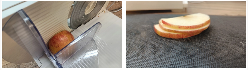 Для фруктовых или овощных чипсов можно сделать тонкую нарезку. Яблоки с легкостью обрабатываются при толщине в 3 мм и толще.