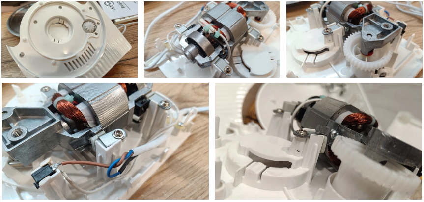 Разберем устройство, чтобы посмотреть используемые материалы, а также электрическую часть. Для этого выкручиваем необходимое количество саморезов под режущим ножом. Внутри установлен электрический щеточный двигатель с медной обмоткой. Обмотка обильно пролита защитным лаком. Ротор двигателя удерживается на основании за счет шариковых подшипников. Ведущая шестеренка на валу из металла. Сам двигатель удерживается на 4 резиновых подвесах с фиксацией на металлические крепления. Вибрация во время работы будет гаситься и снижаться образующийся шум.