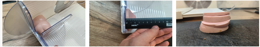 А теперь попробуем нарезать колбасу. Лучше всего использовать круглый батон, так будет лучше фиксироваться в фиксаторе. Колбасу мне получилось нарезать в диапазоне от 5 до 17 мм. Возможно еще не хватает опыта в данном вопросе или колбаса слишком мягкая.
